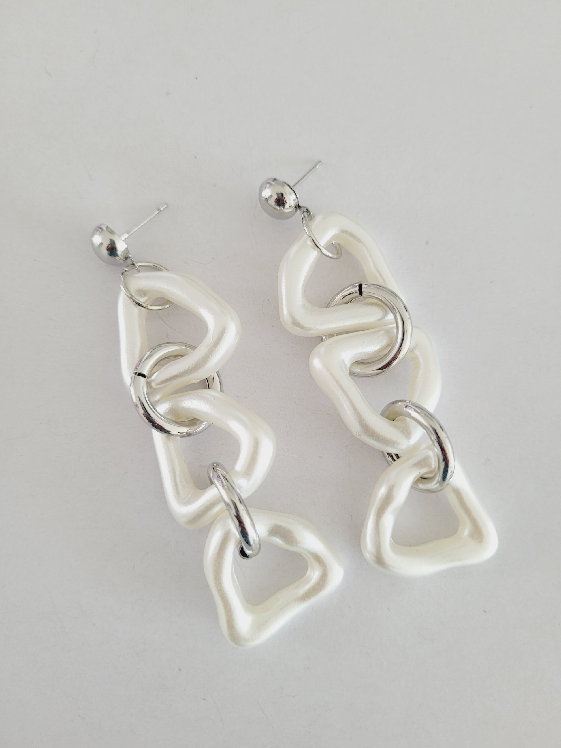 Earrings with 3 intertwined white pearl hearts tied with silver hoops. Let love embrace you.