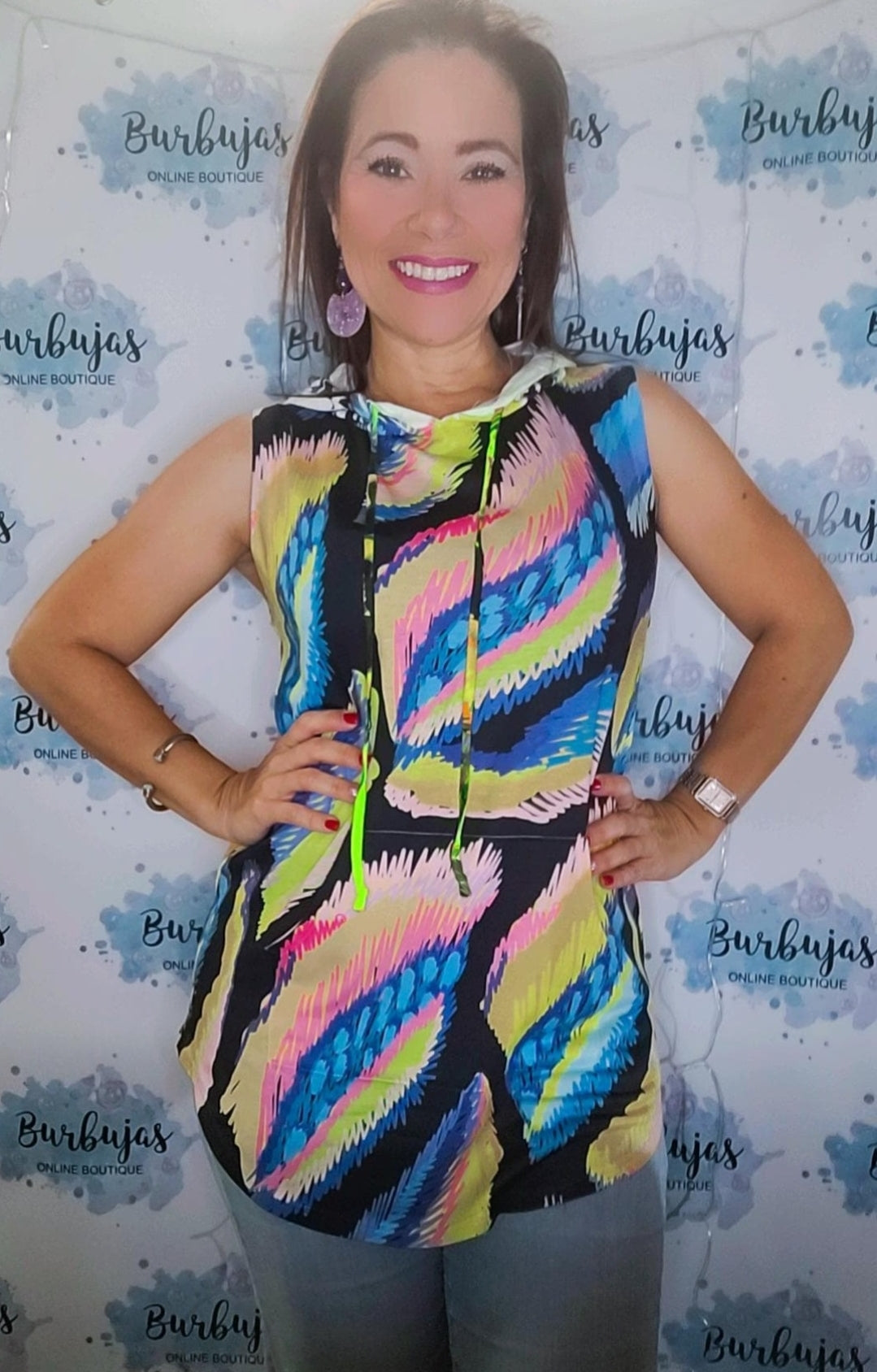 Hermosa camisa estilo hoodie sin mangas en colores brillantes. Colores que te hacen brillar y reflejar alegría. Este es tu estilo.