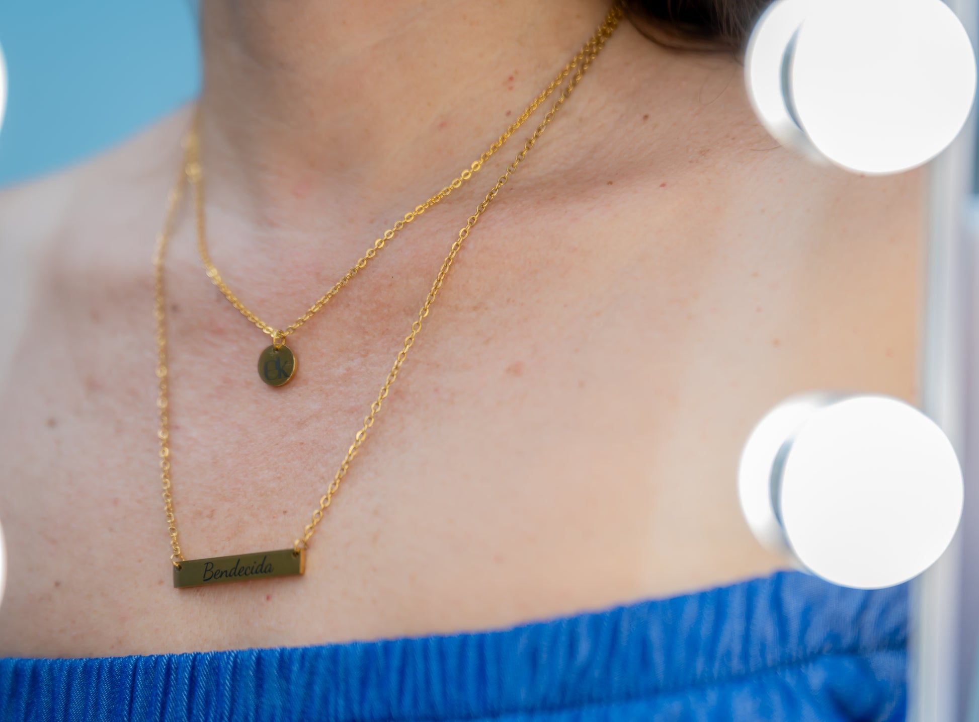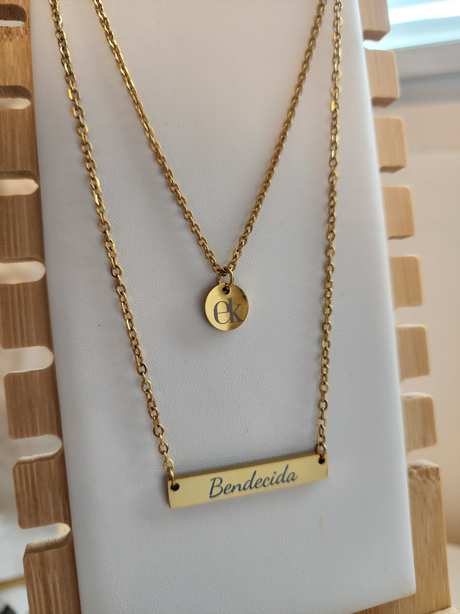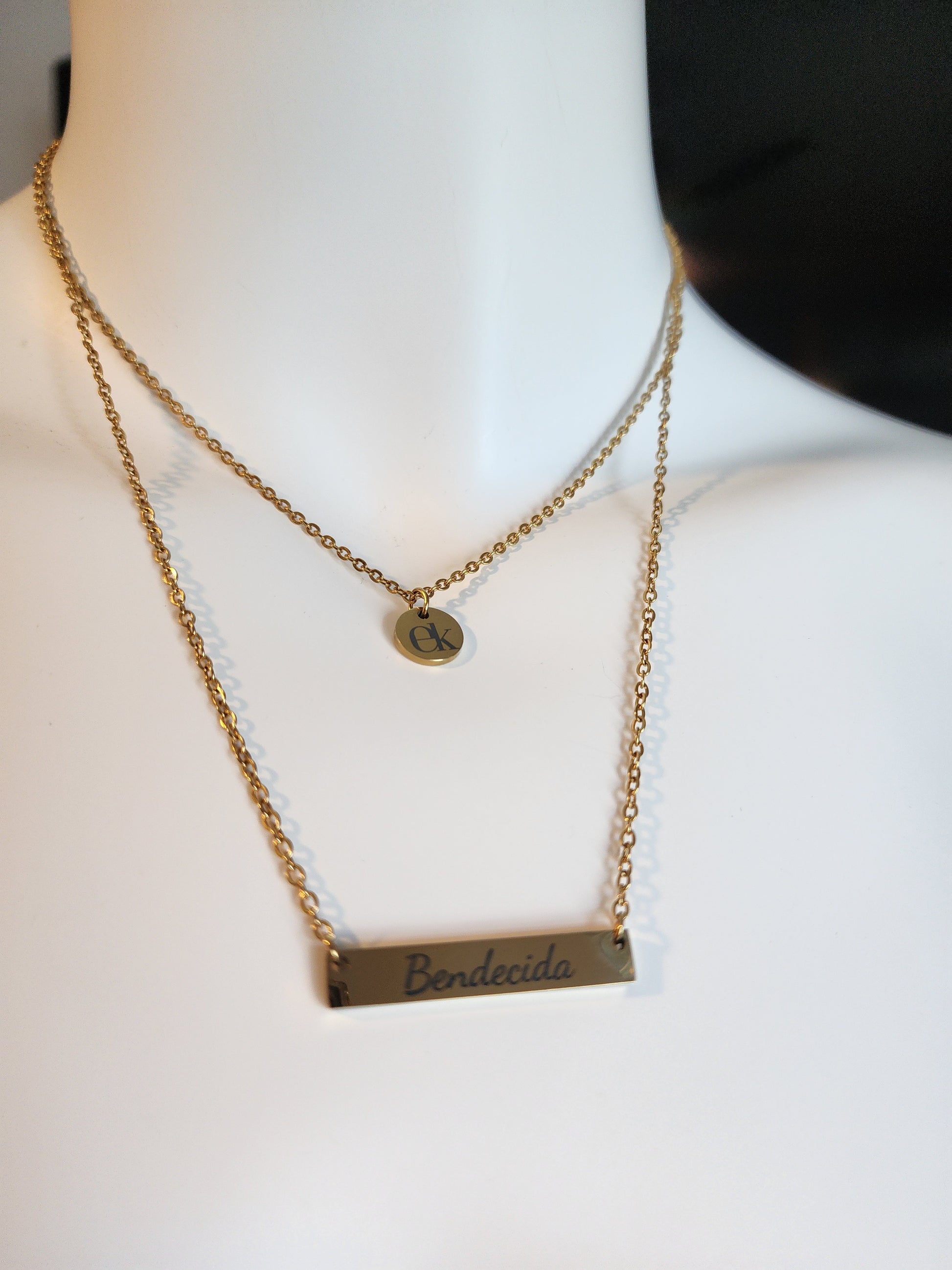 La cadena más corta lleva el pendan con la EK de Escentik, representación de autenticidad, mientras que la cadena más larga sostiene la palabra “Bendecida”, tu recordatorio diario de que todo lo que eres y lo que tienes es un regalo.