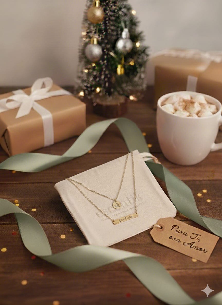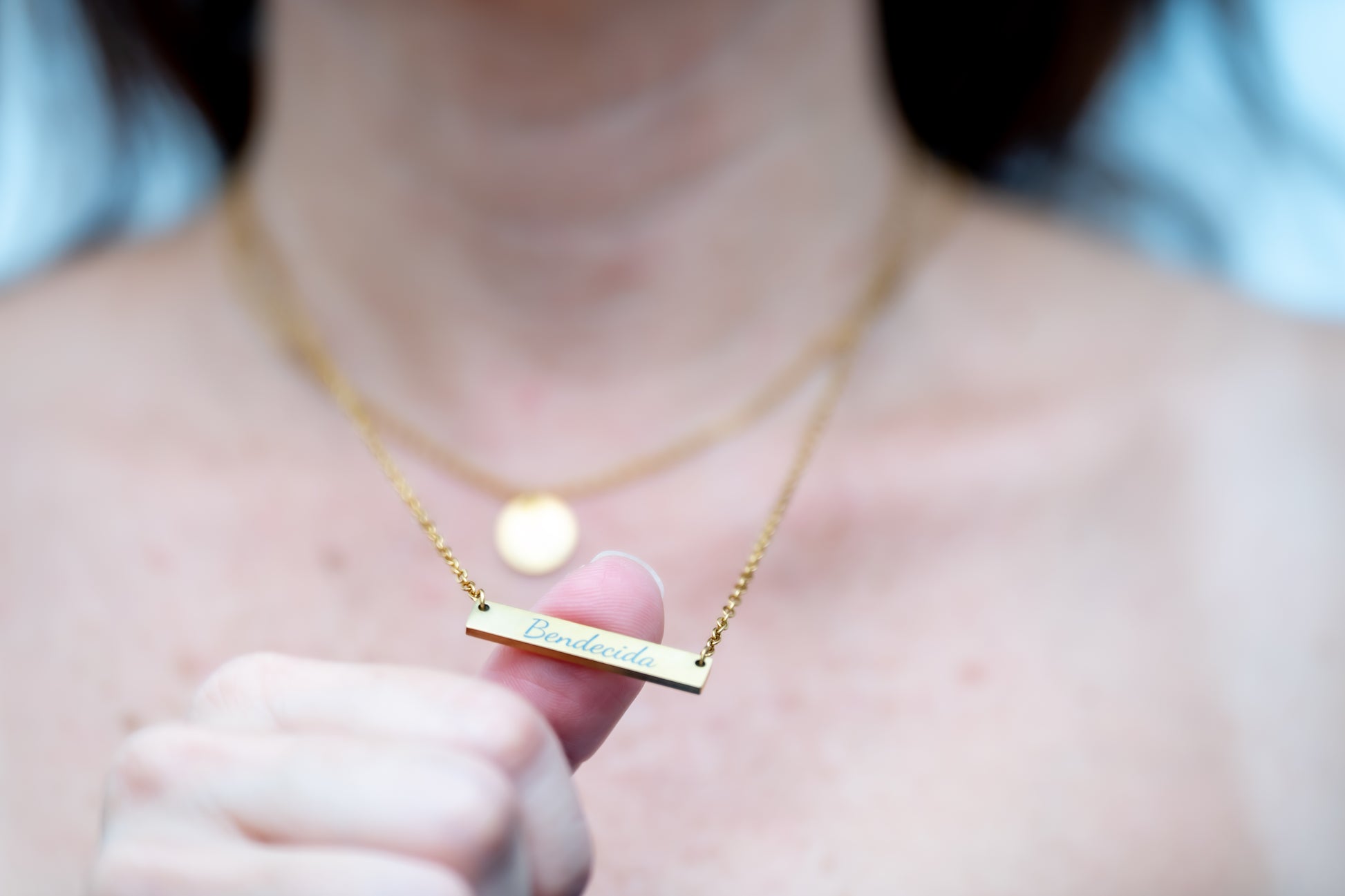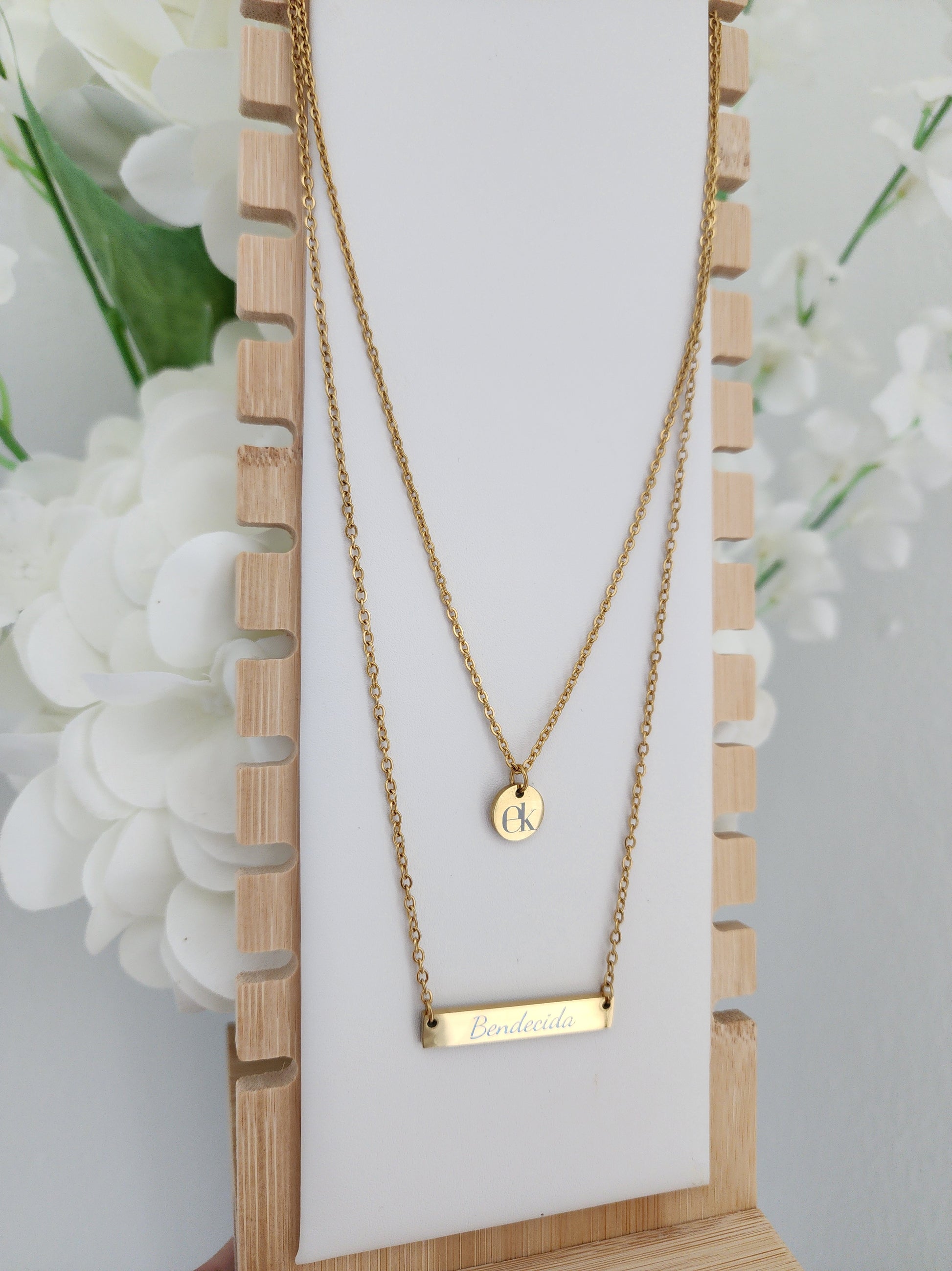 La cadena más corta lleva el pendan con la EK de Escentik, representación de autenticidad, mientras que la cadena más larga sostiene la palabra “Bendecida”, tu recordatorio diario de que todo lo que eres y lo que tienes es un regalo.