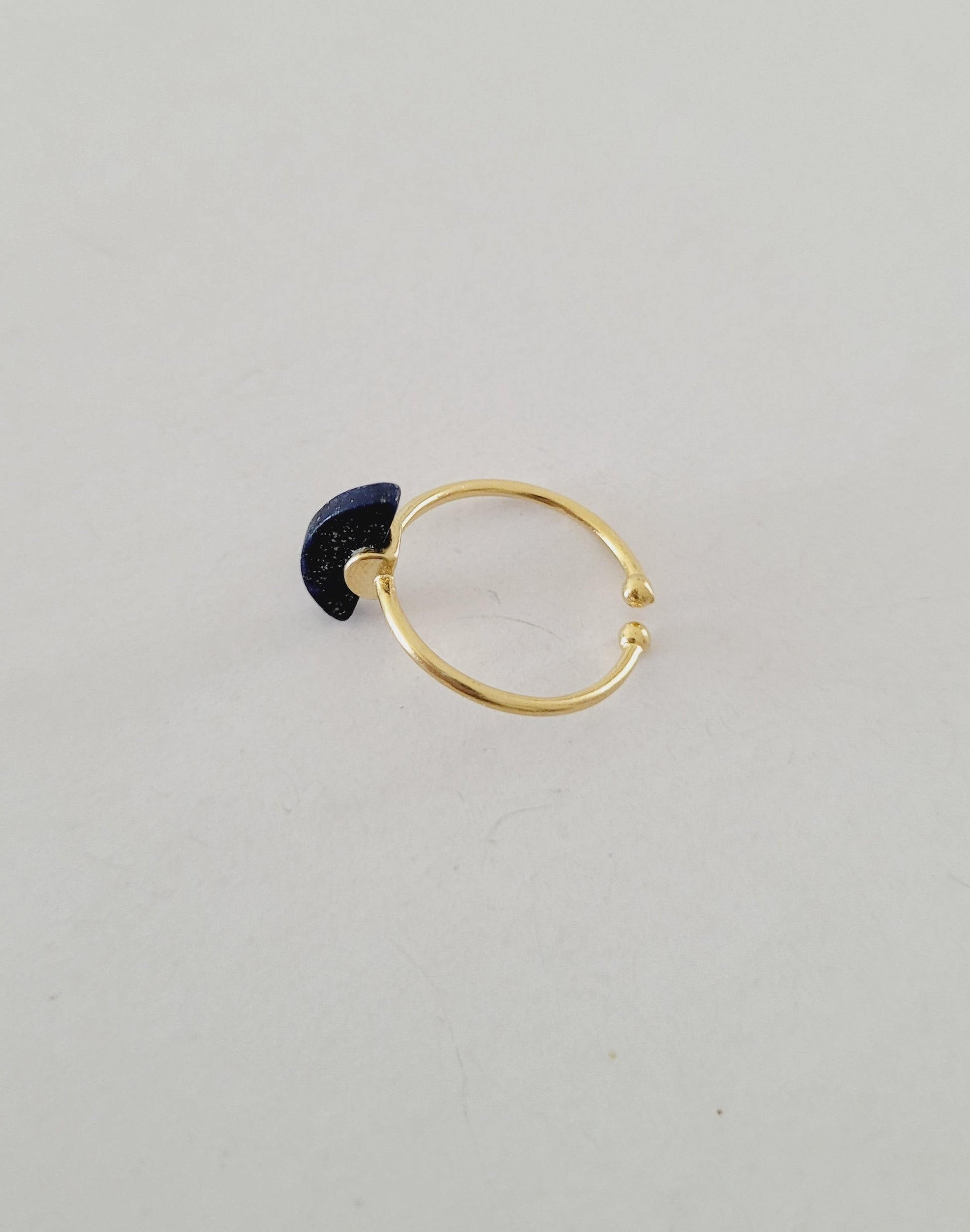 Spectacular and simple golden adjustable ring with a blue stone in the shape of a small fan. You have always been distinguished by singles and this one is perfect for you.