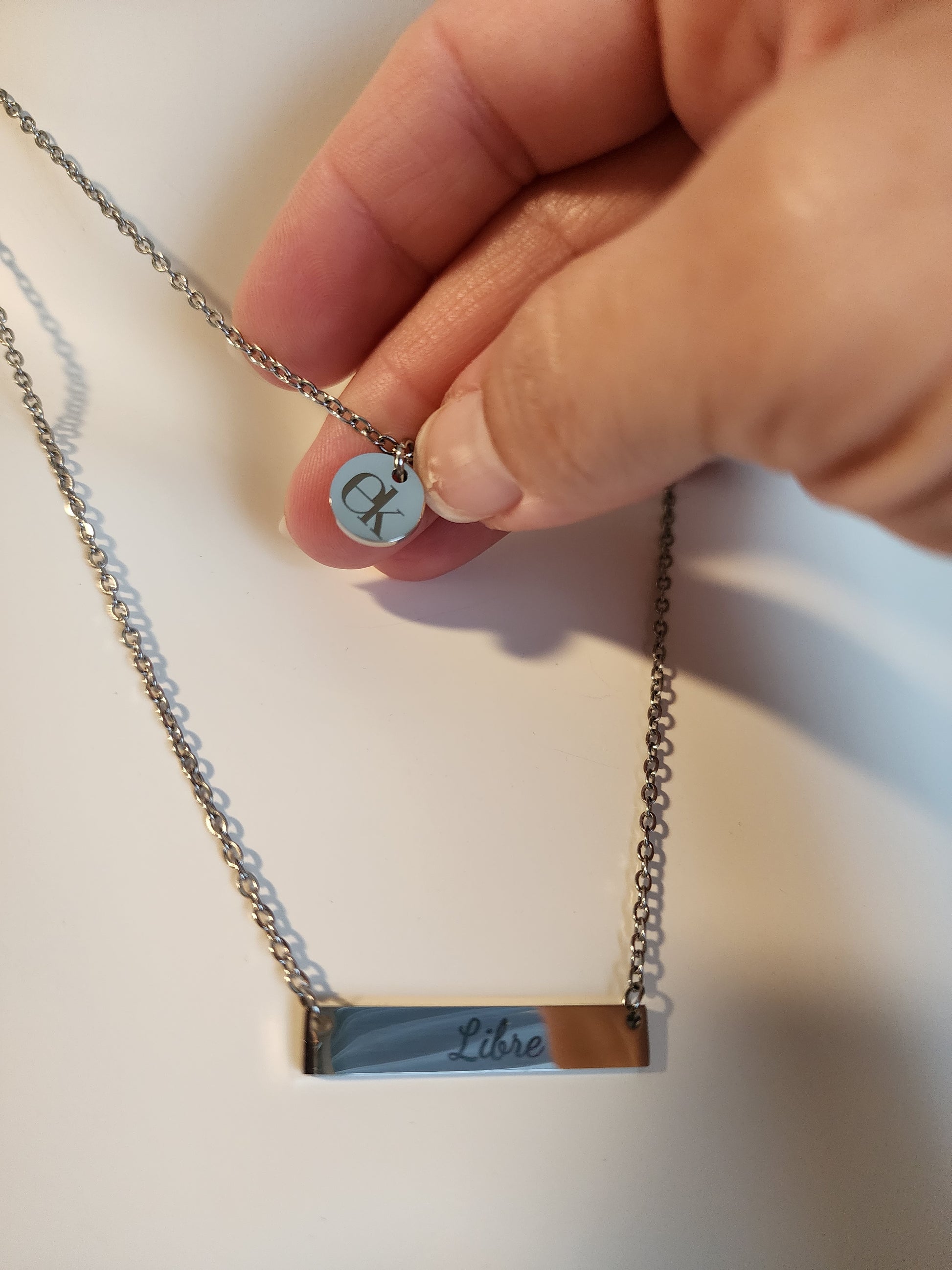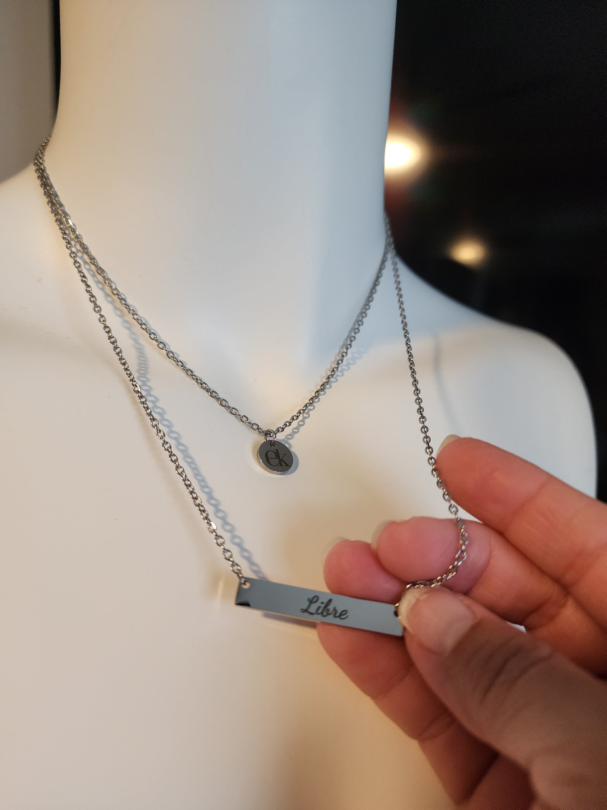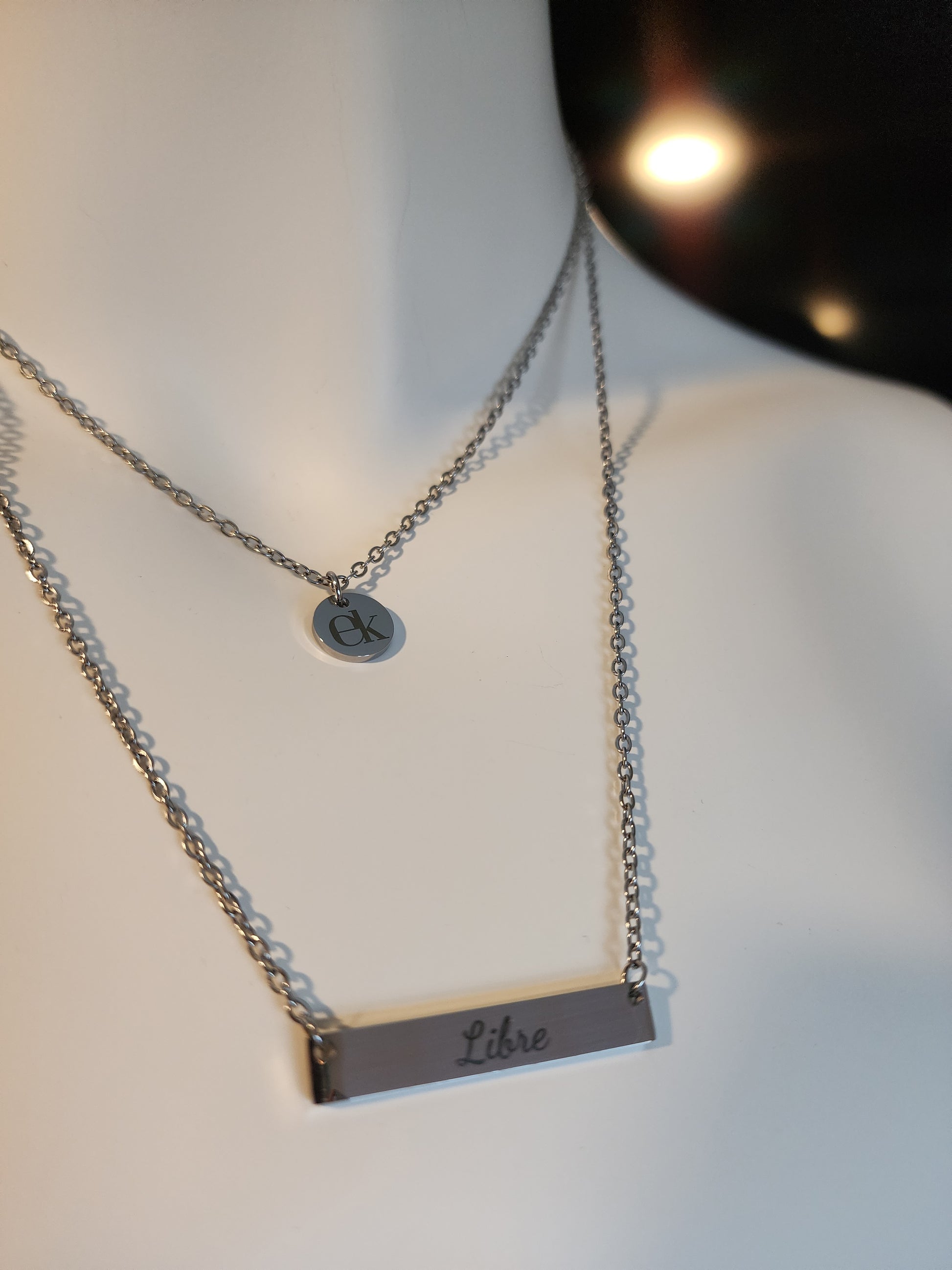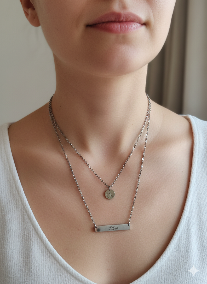 Ser libre es abrazar tu esencia, caminar con seguridad y vivir sin cadenas que te detengan. Esta pieza fue diseñada para recordarte que tienes el poder de elegir, de soñar y de volar alto. Su diseño retro en doble cadena (una más corta y otra más larga en una sola pieza) une estilo y significado: en la cadena corta, el dije con la EK de Escentik, y en la larga, la palabra poderosa “Libre”, un mensaje que llevarás siempre contigo como símbolo de autenticidad y fuerza.