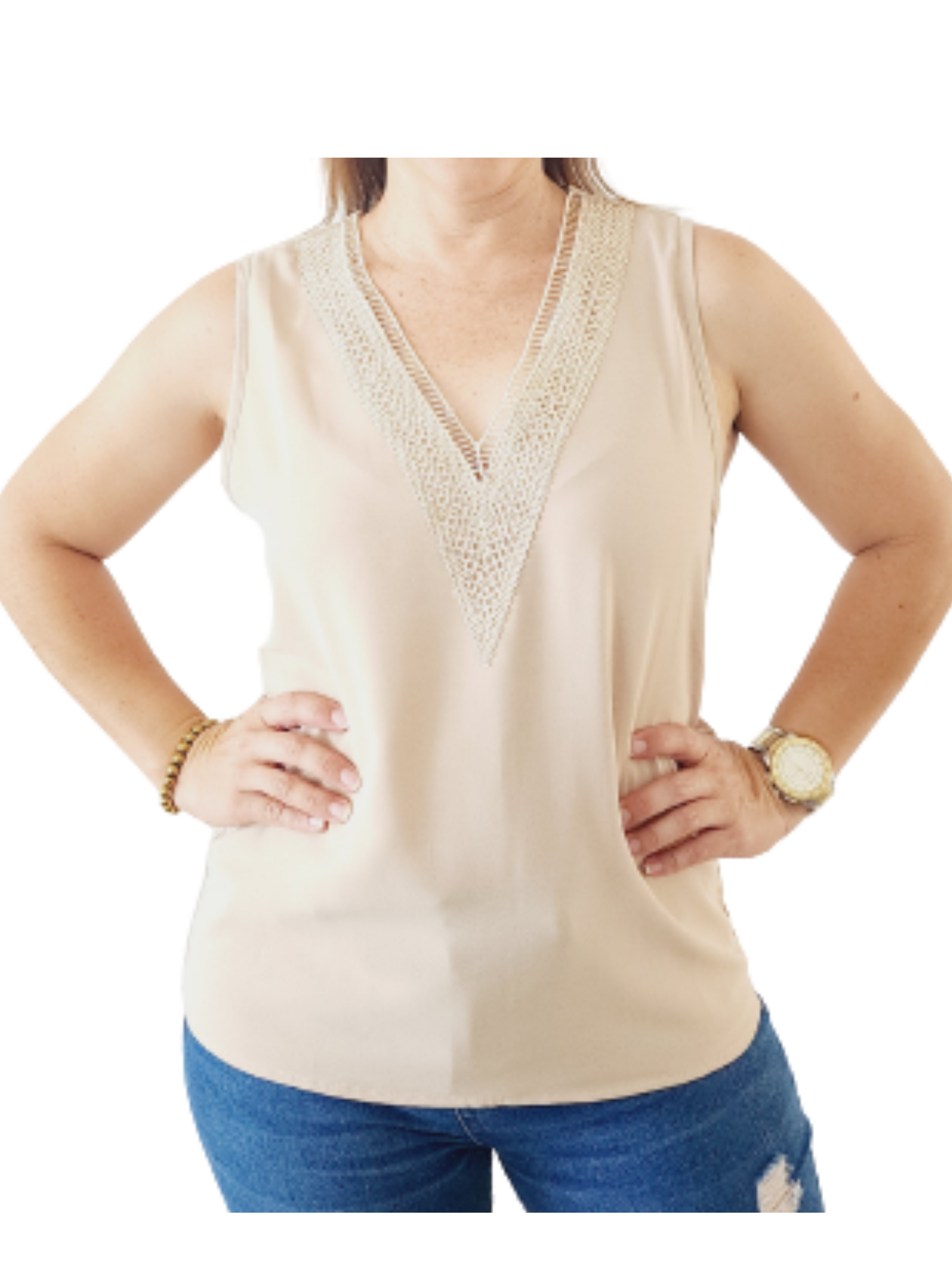 Top crema con cuello V con hermoso encaje en el área del cuello. Tanto para trabajar como para salir te luce muy bien.
