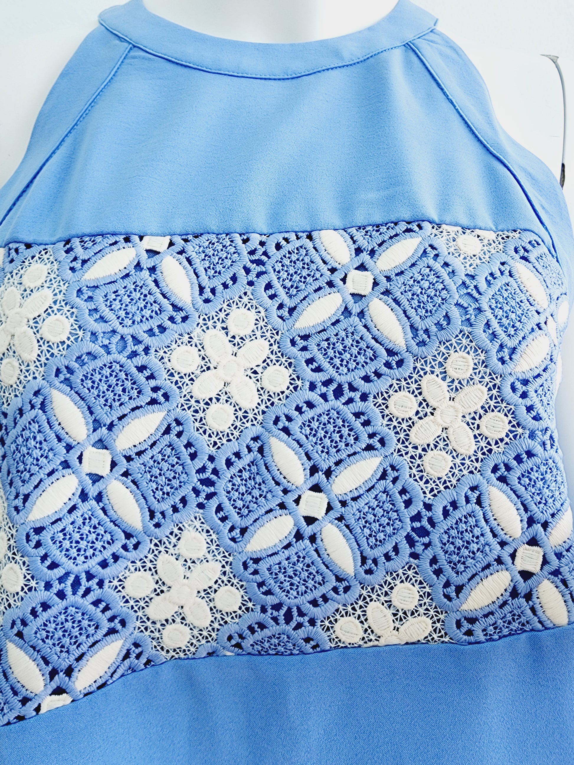 Camisa azul claro sin mangas con tejido color crema y blanco. Que bien te queda para esa actividad siempre llevando contigo ese toque ideal.