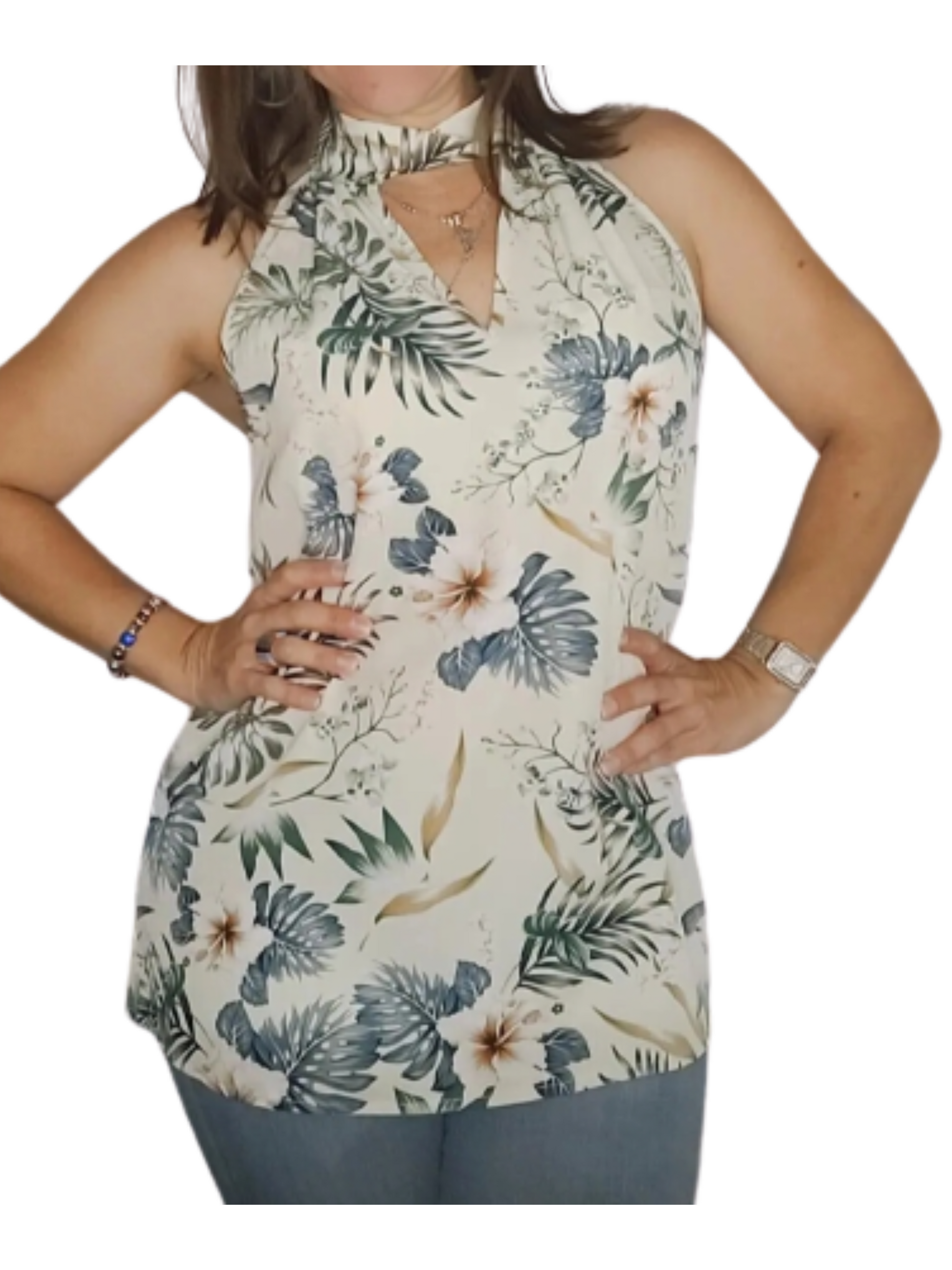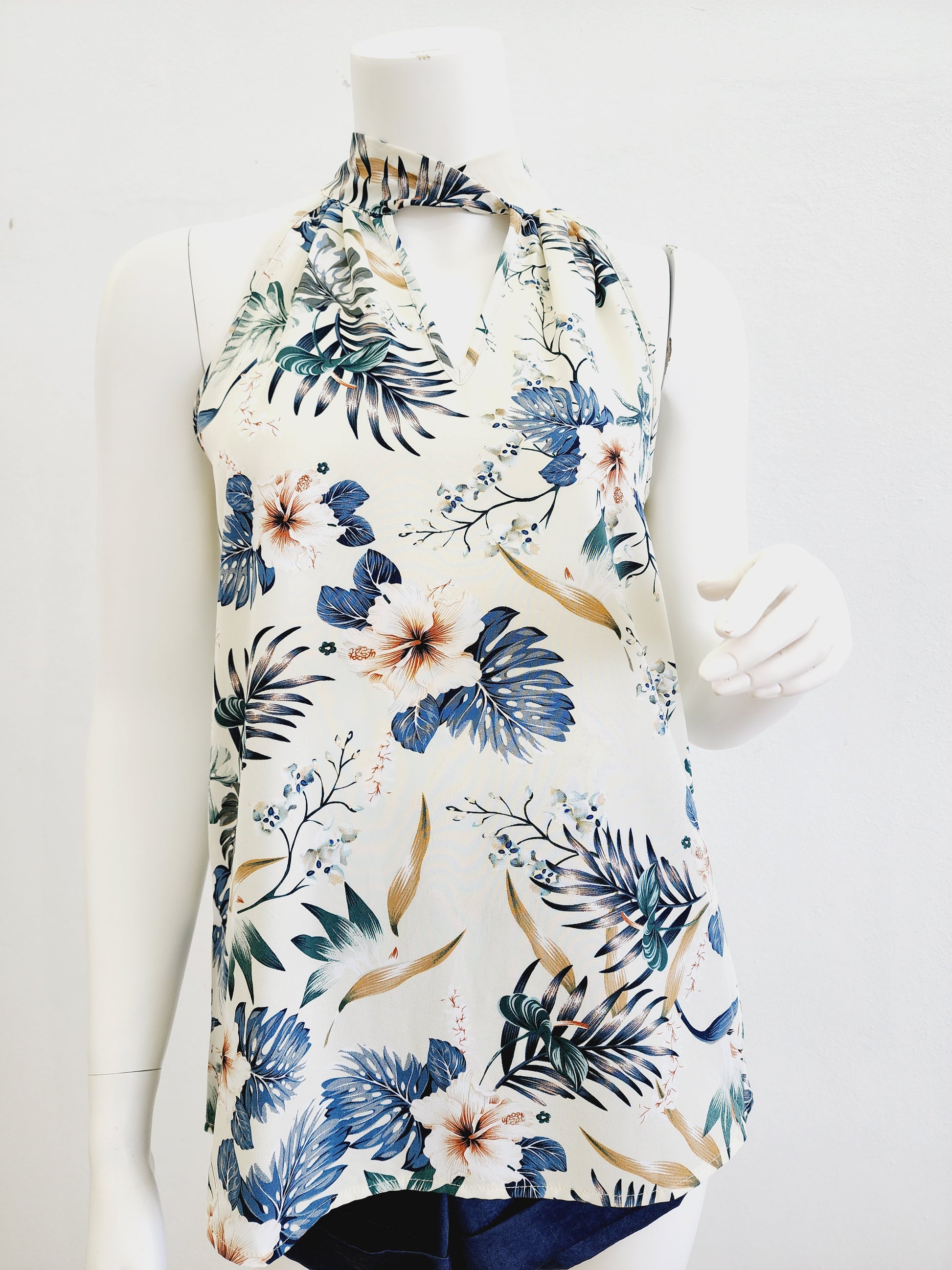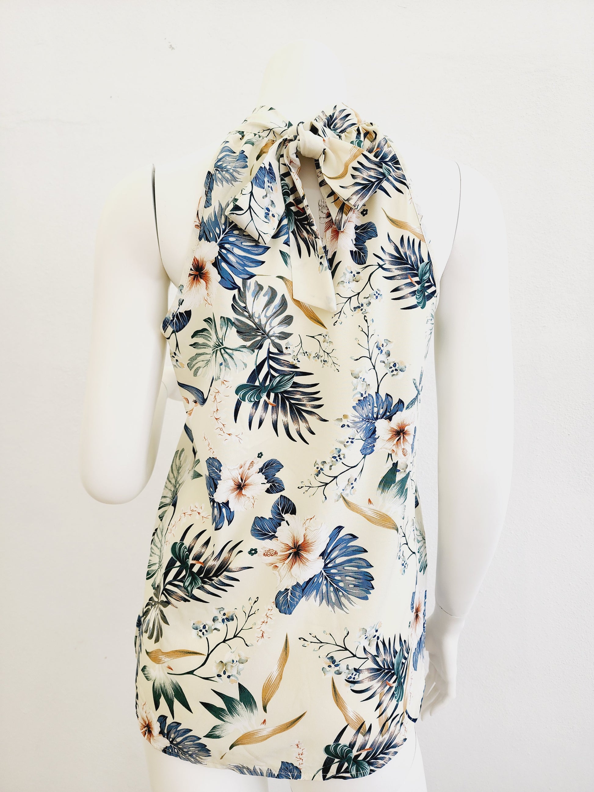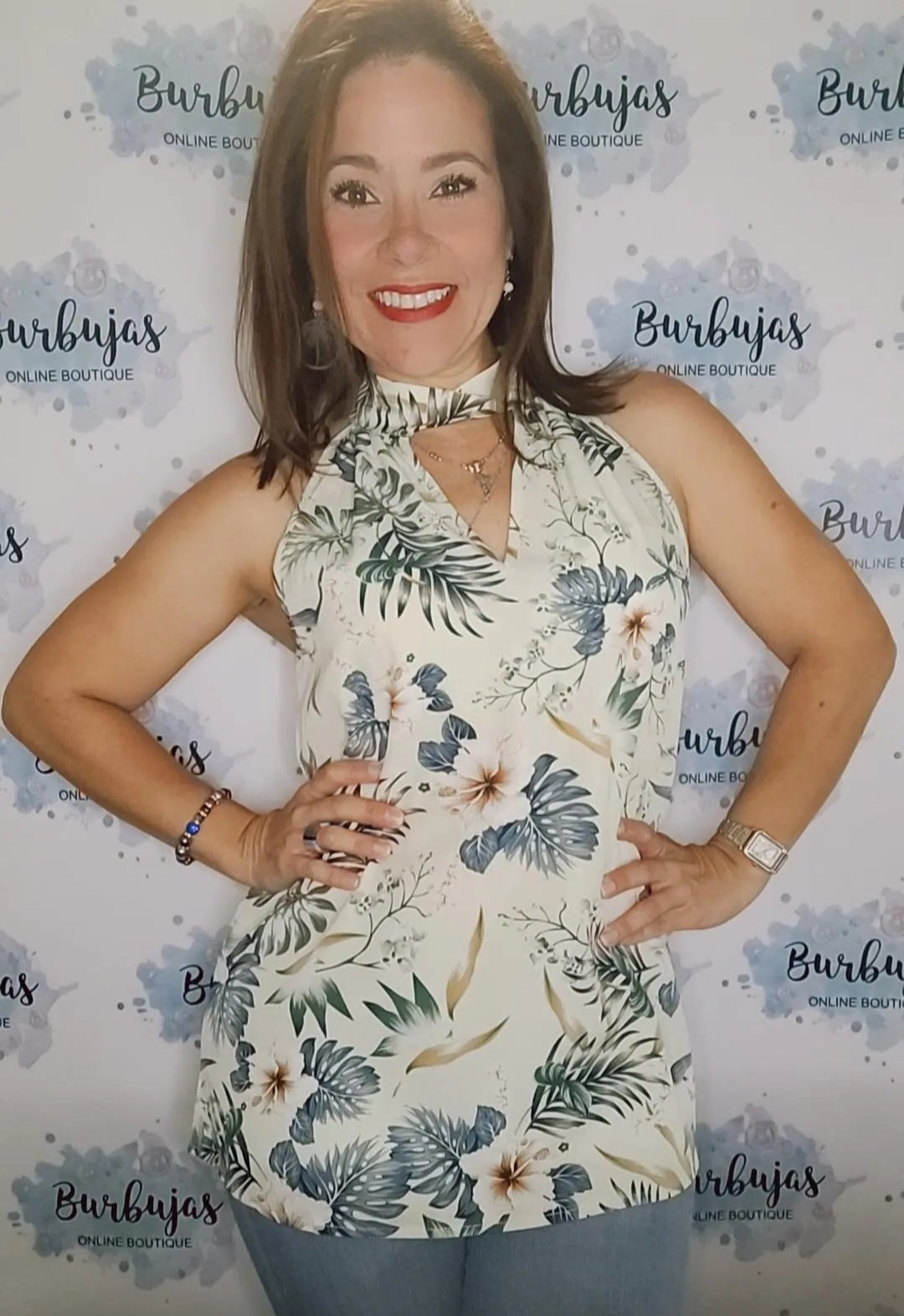 Hermosa camisa con estampado de flores color crema de fondo cuello alto con dobles y V amarrado con lazo en la parte de atrás y es super refrescante. LLévala con el estilo que solo tu sabes darle.