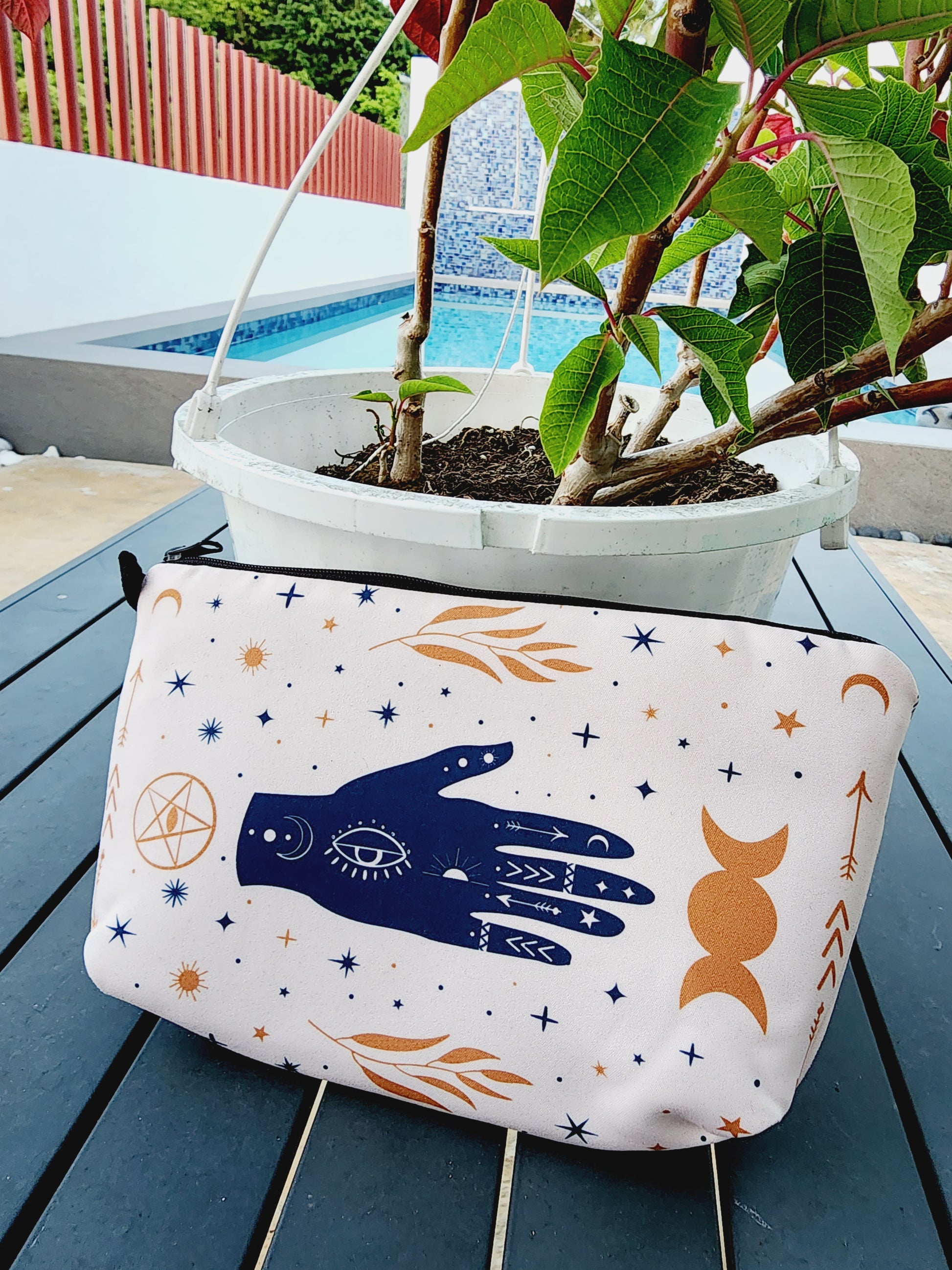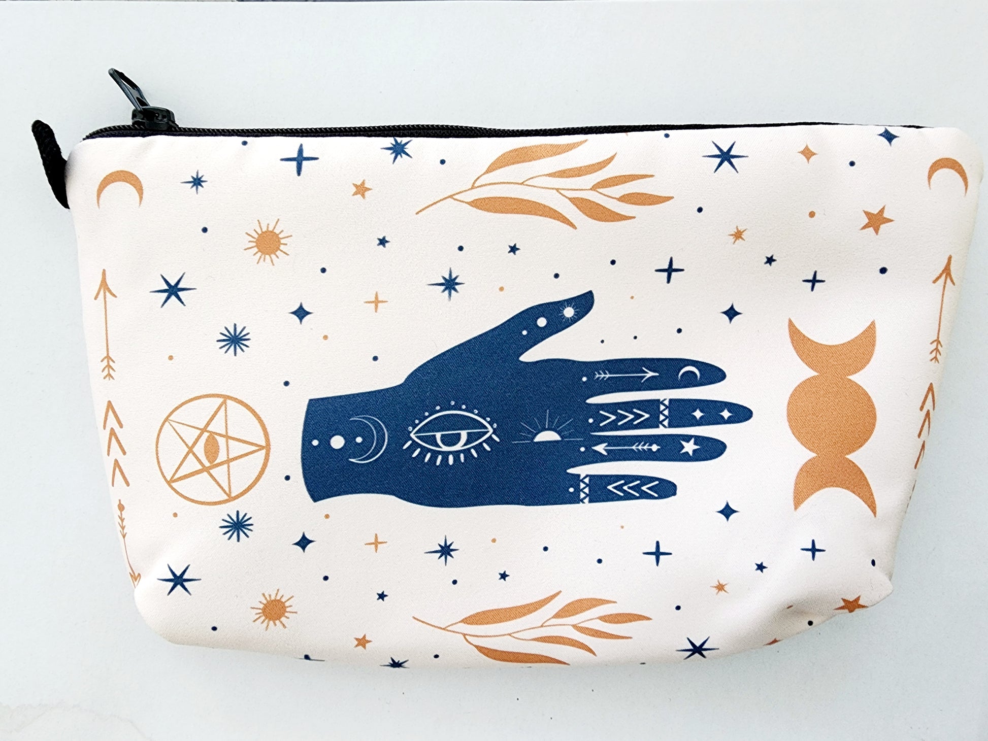 Bolsa de cosméticos suave impresa a mano gitana. LLeva tus cosméticos con tu estilo único. Esta forrada por dentro y su tela es suave.