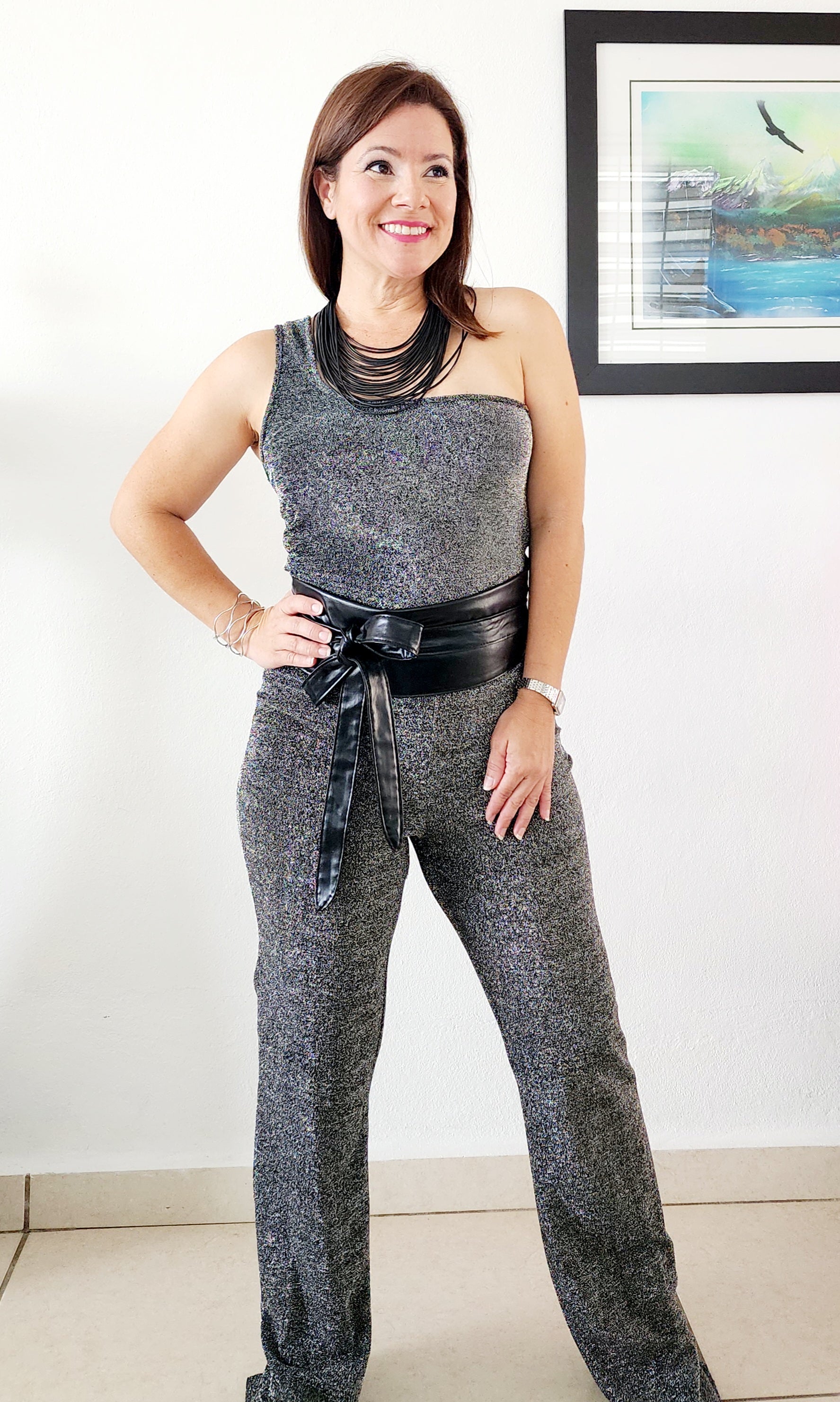 Un jumpsuit que equilibra elegancia y modernidad. Eclipse de Medianoche en charcoal gray destaca por su sutil brillo y su diseño one shoulder, que realza tu porte con un toque sofisticado. Su tela con mezcla de poliéster, nylon y spandex se adapta a tu figura, proporcionando comodidad y un ajuste perfecto.