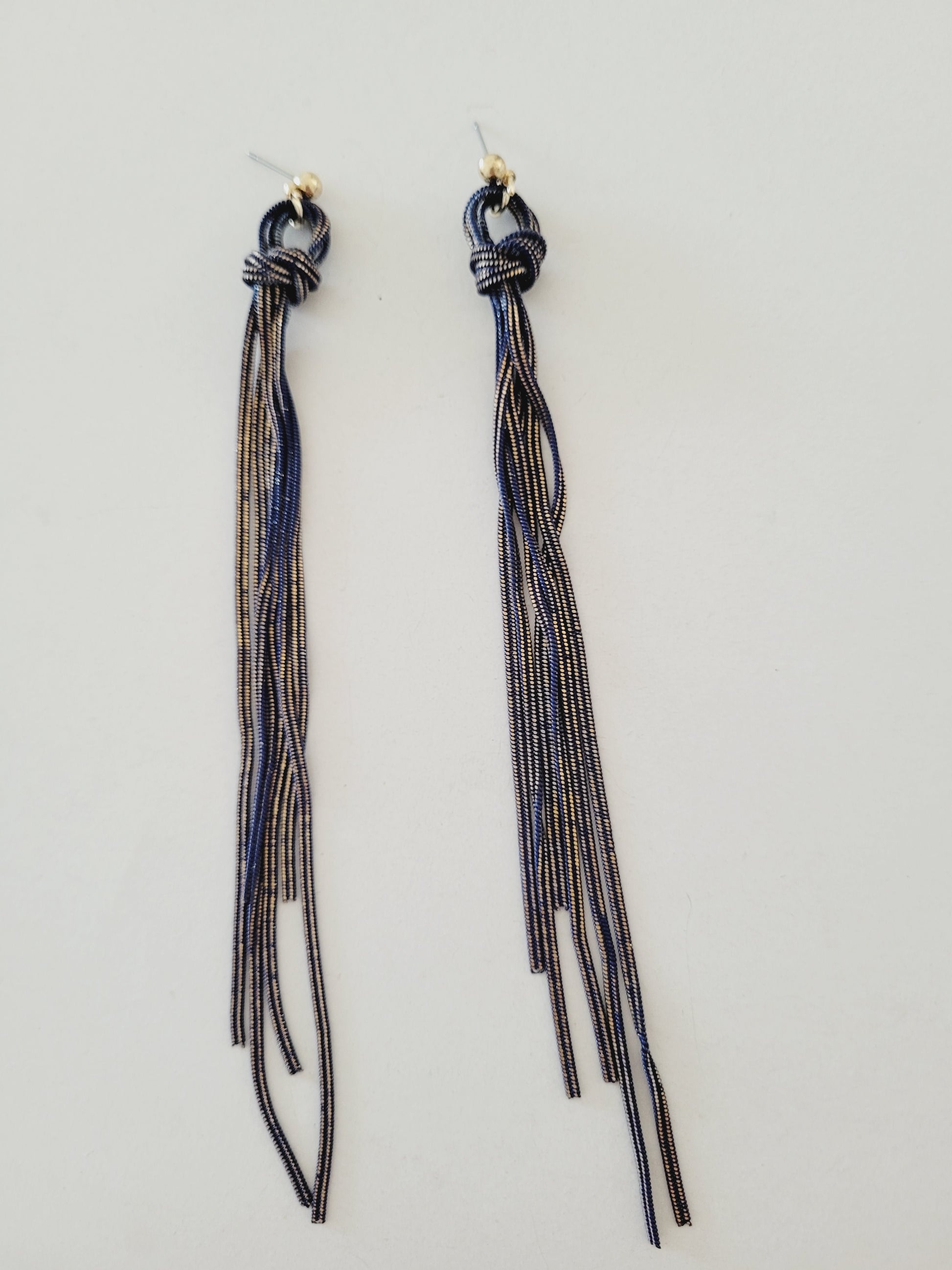 Beautiful long earrings in white and blue fringes, perfect for that shirt or dress that does not have a necklace.