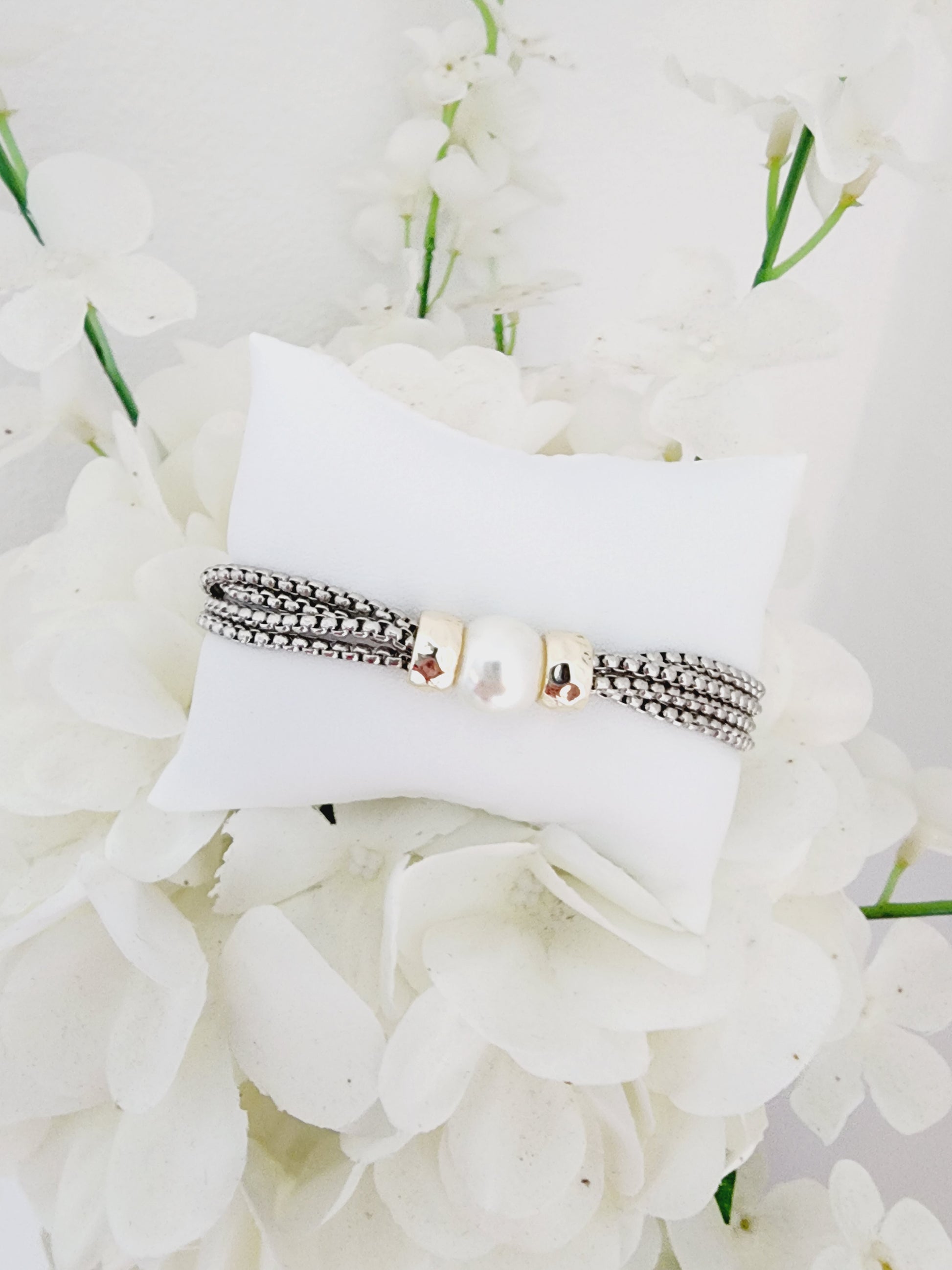 Necklace and bracelet set in rhodium, silver, gold and pearls
