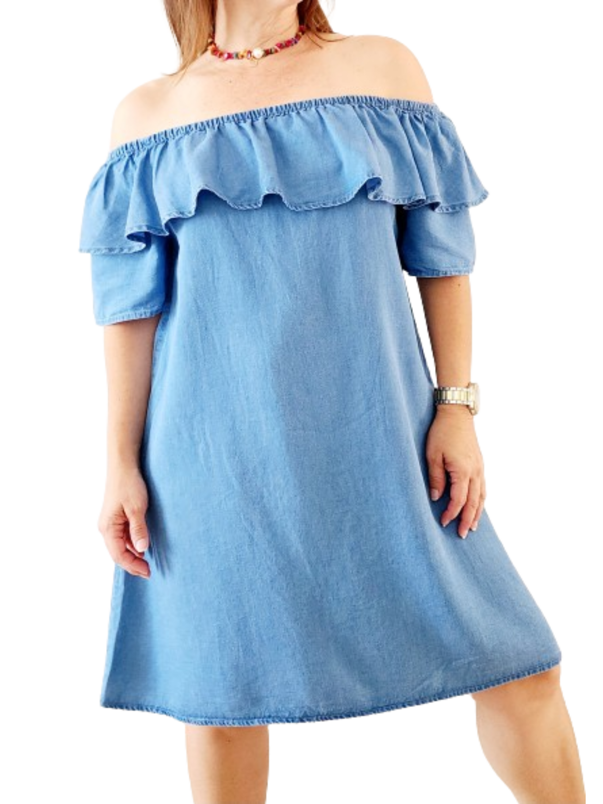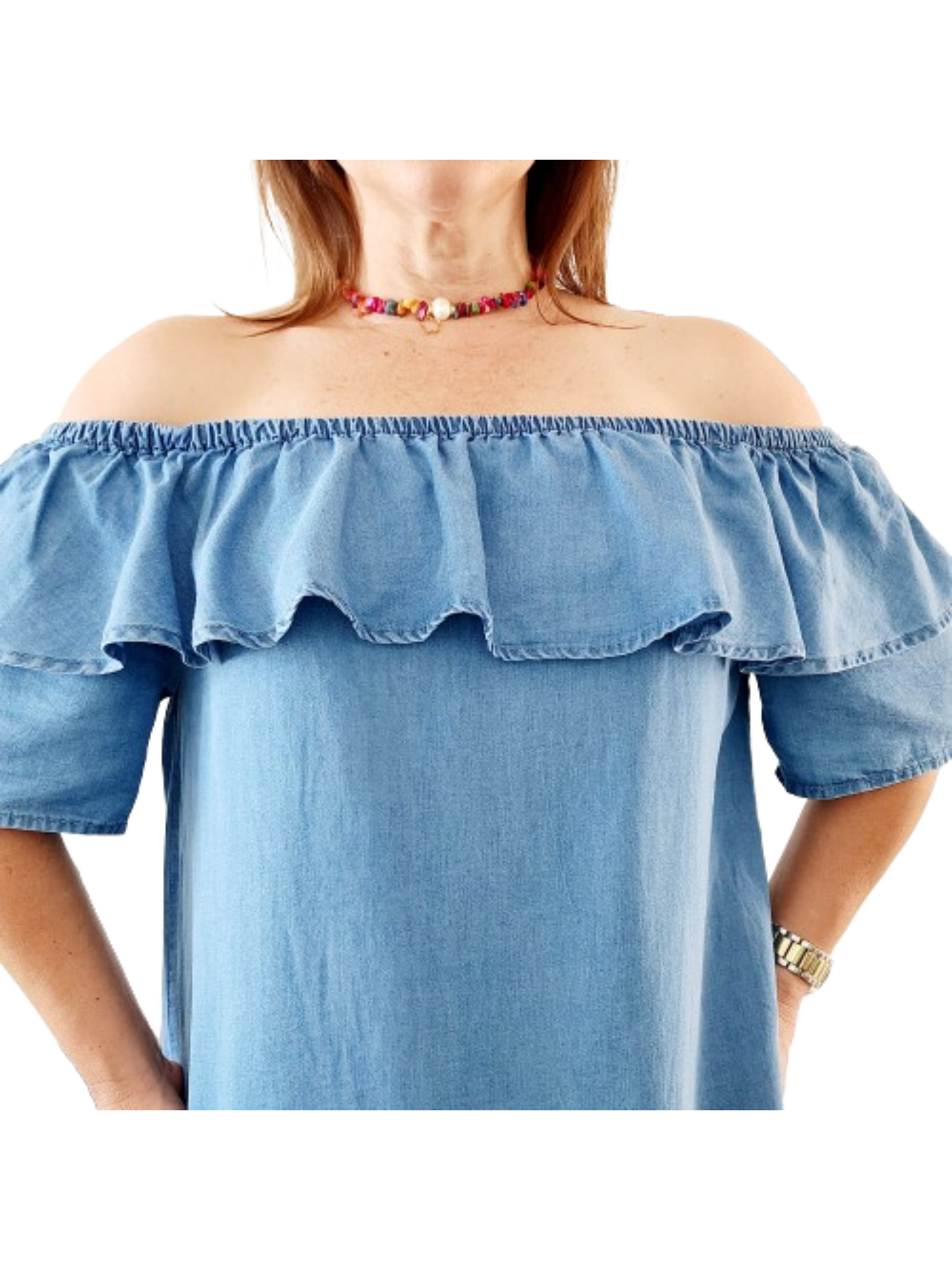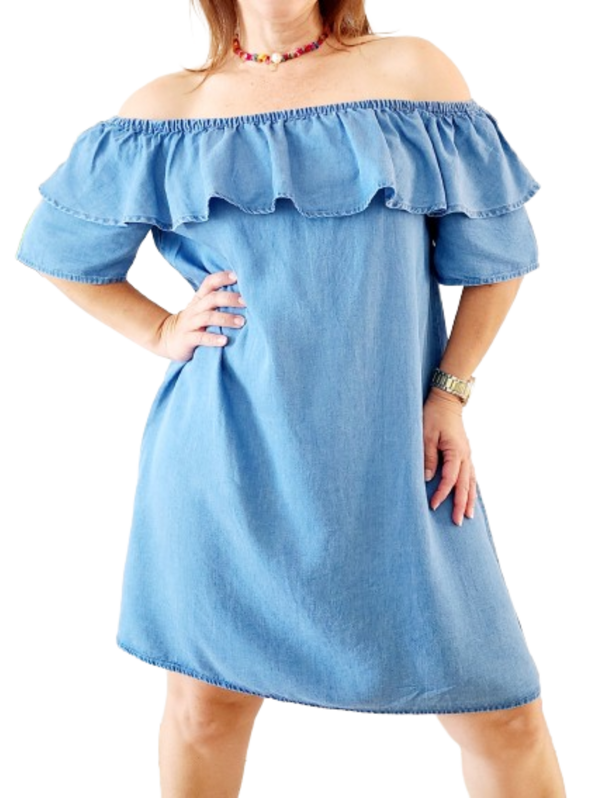 Vestido off shoulder en color mahón con volante en la parte de arriba. Luce cómoda y fresca con este bello vestido a donde quiera que vayas.