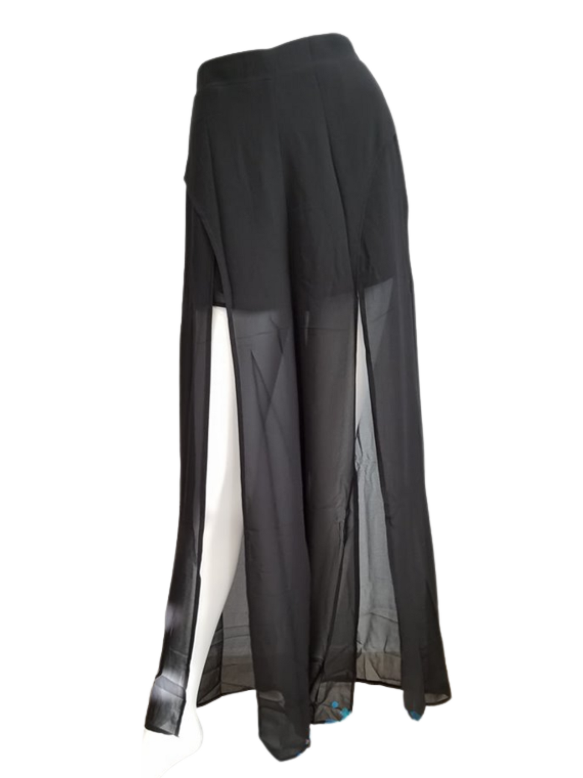Luce como todo una diva de pasarela con este hermoso pantalón en transparencia corto y largo a la vez. Cautivarás la atención de todos. Abierto alfrente y flota al caminar.