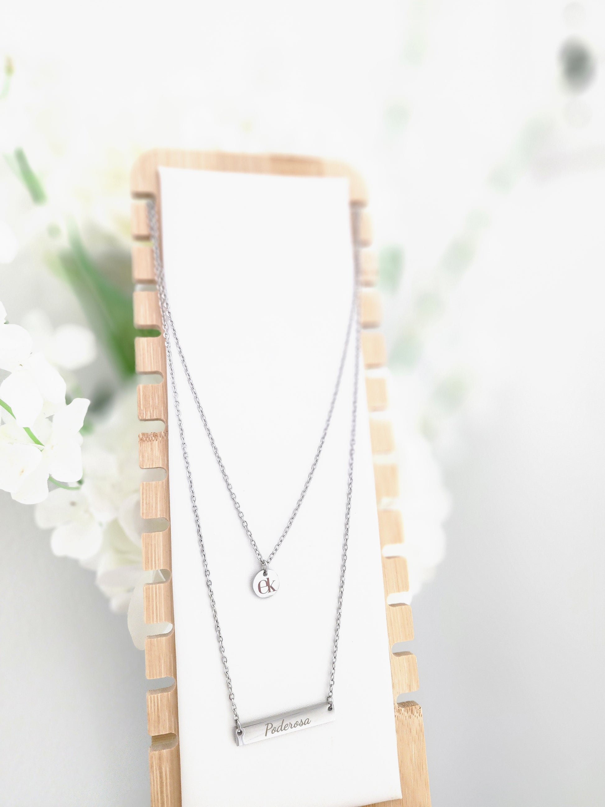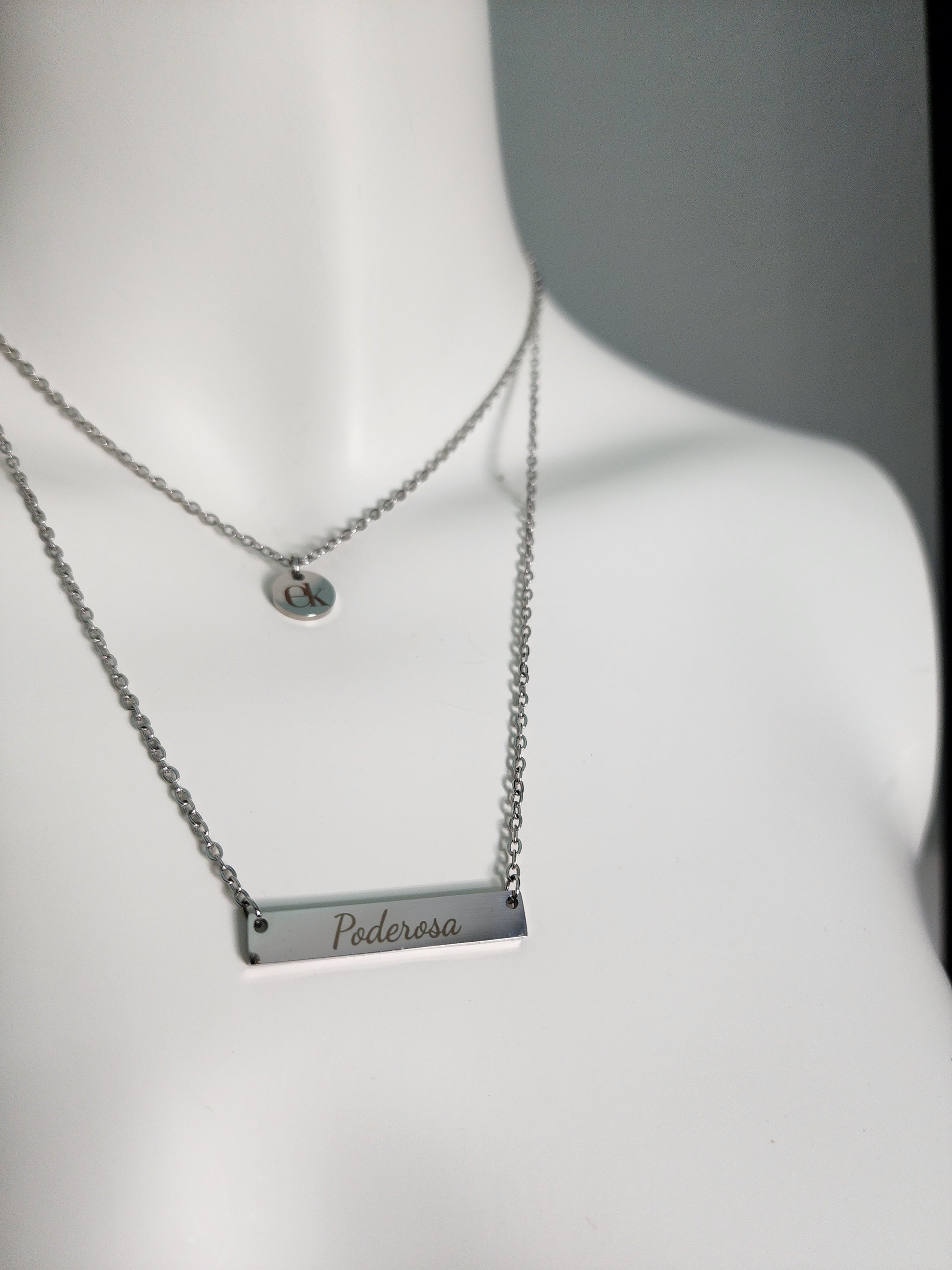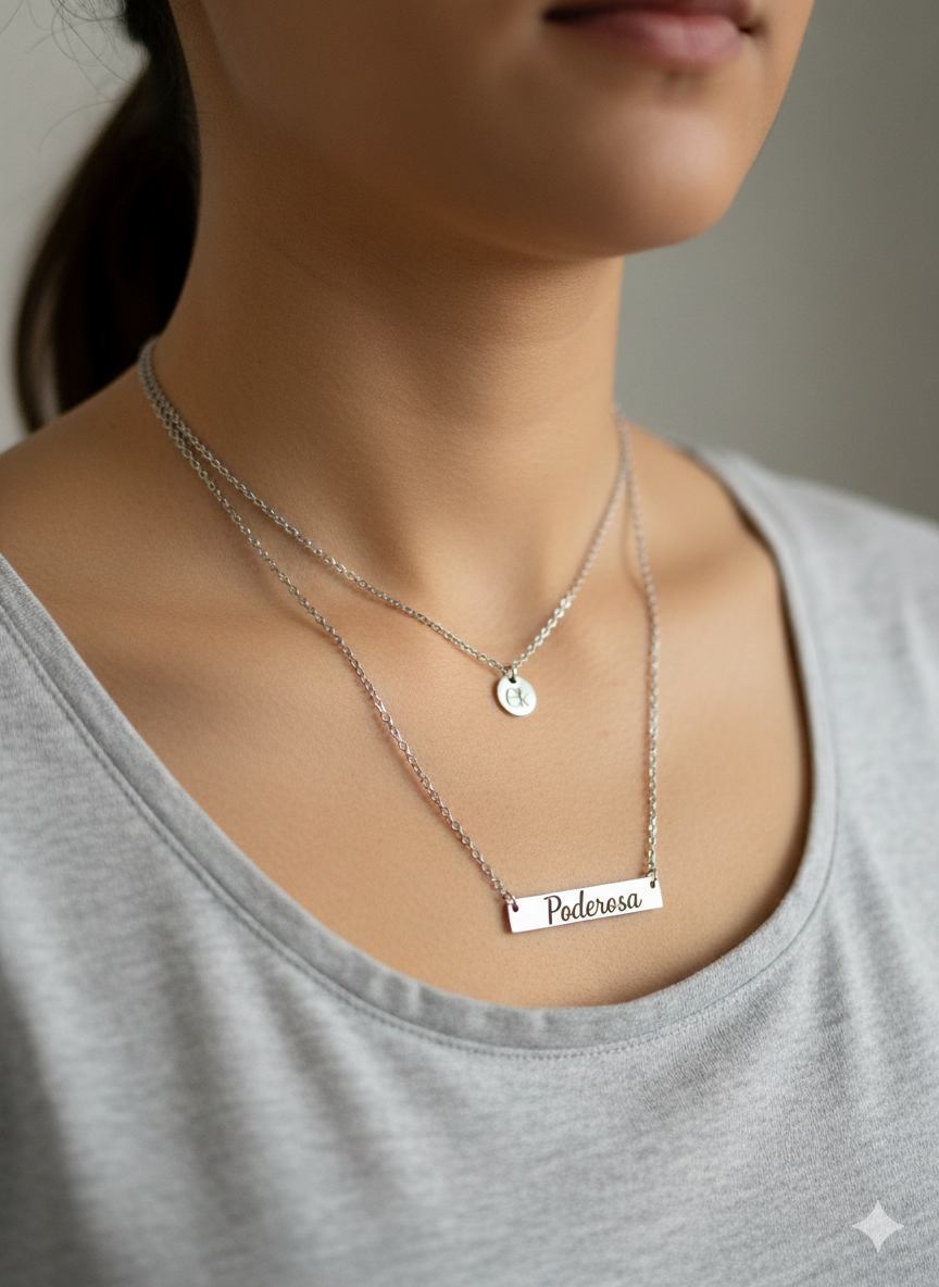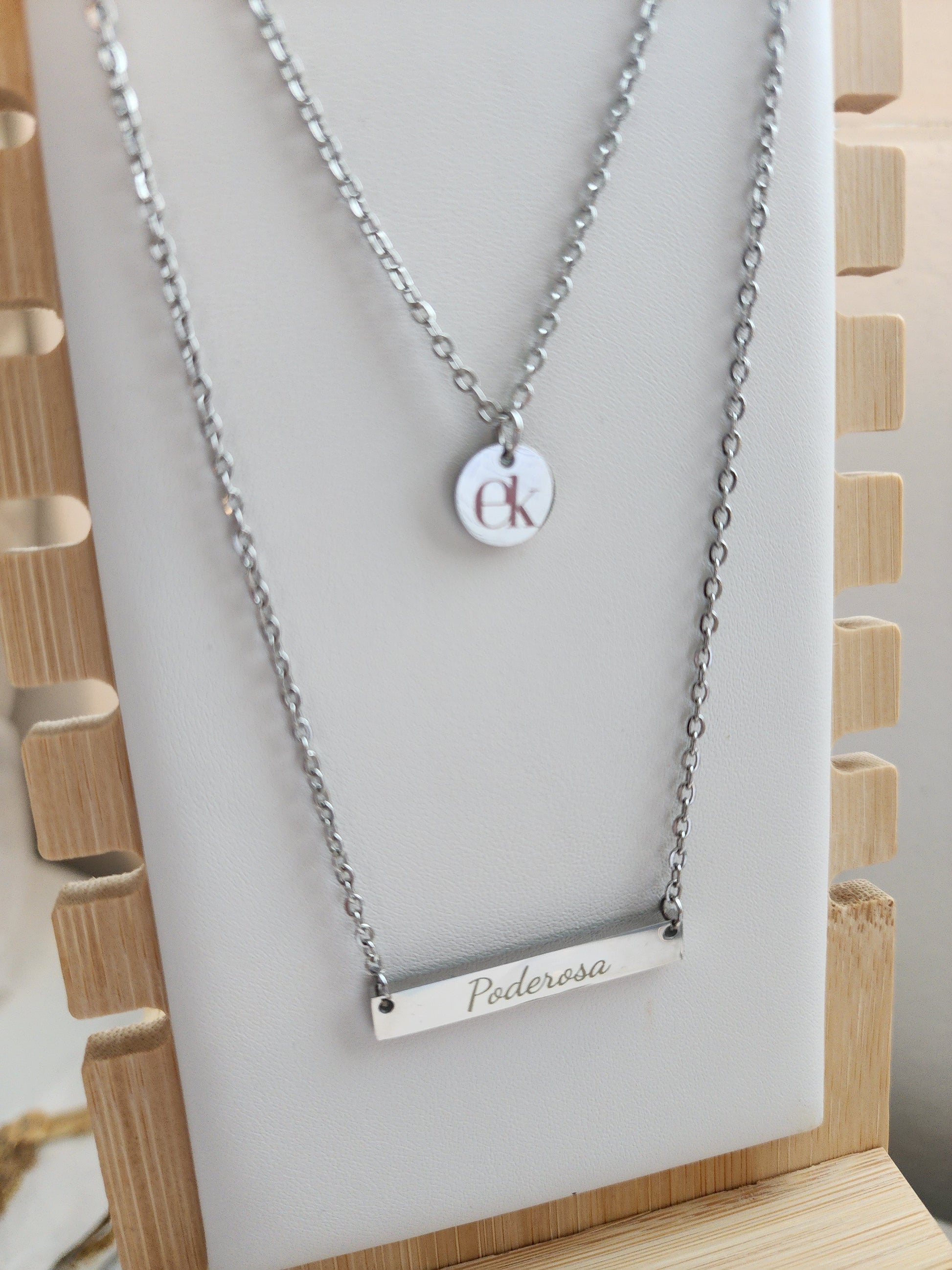 La cadena más corta lleva el pendan con la EK de Escentik, representación de tu autenticidad, mientras que la cadena más larga sostiene la palabra “Poderosa”, tu recordatorio diario de que nada puede detenerte.