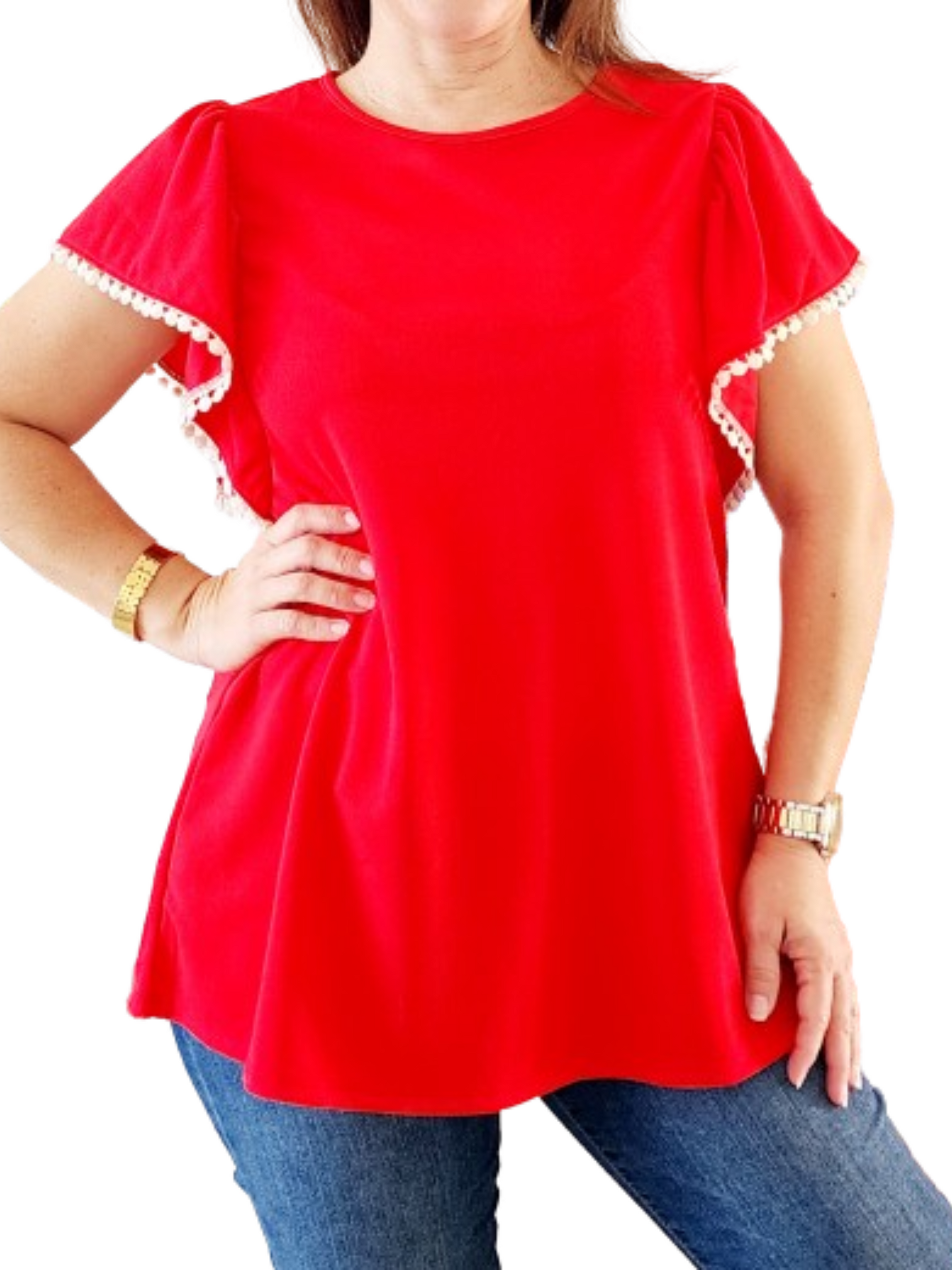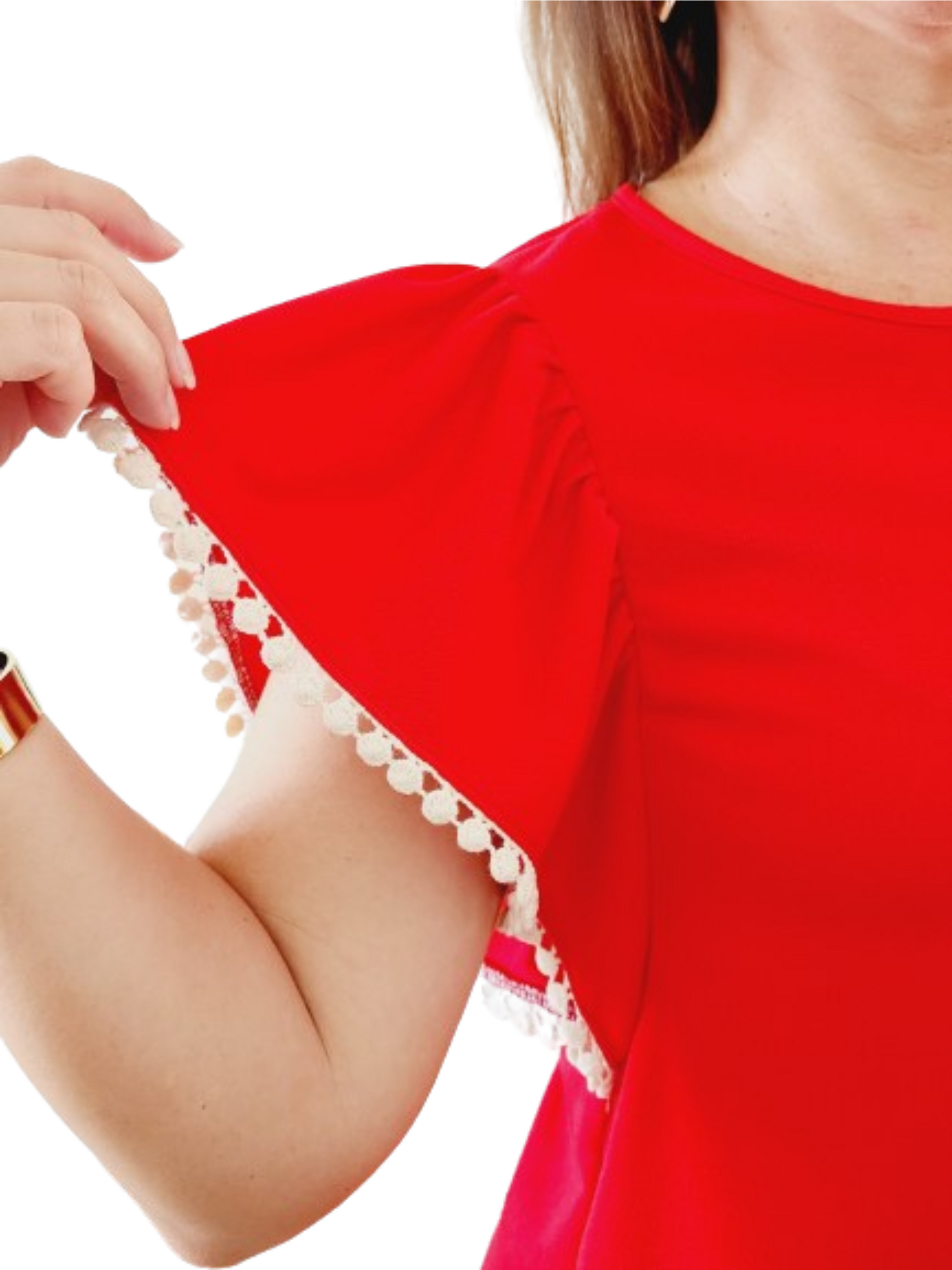 Red top with short, but wide sleeves with a cream-colored embroidered detail and a unique style. He looks very elegant and dresses very well. Perfect for these days where love and friendship are celebrated.