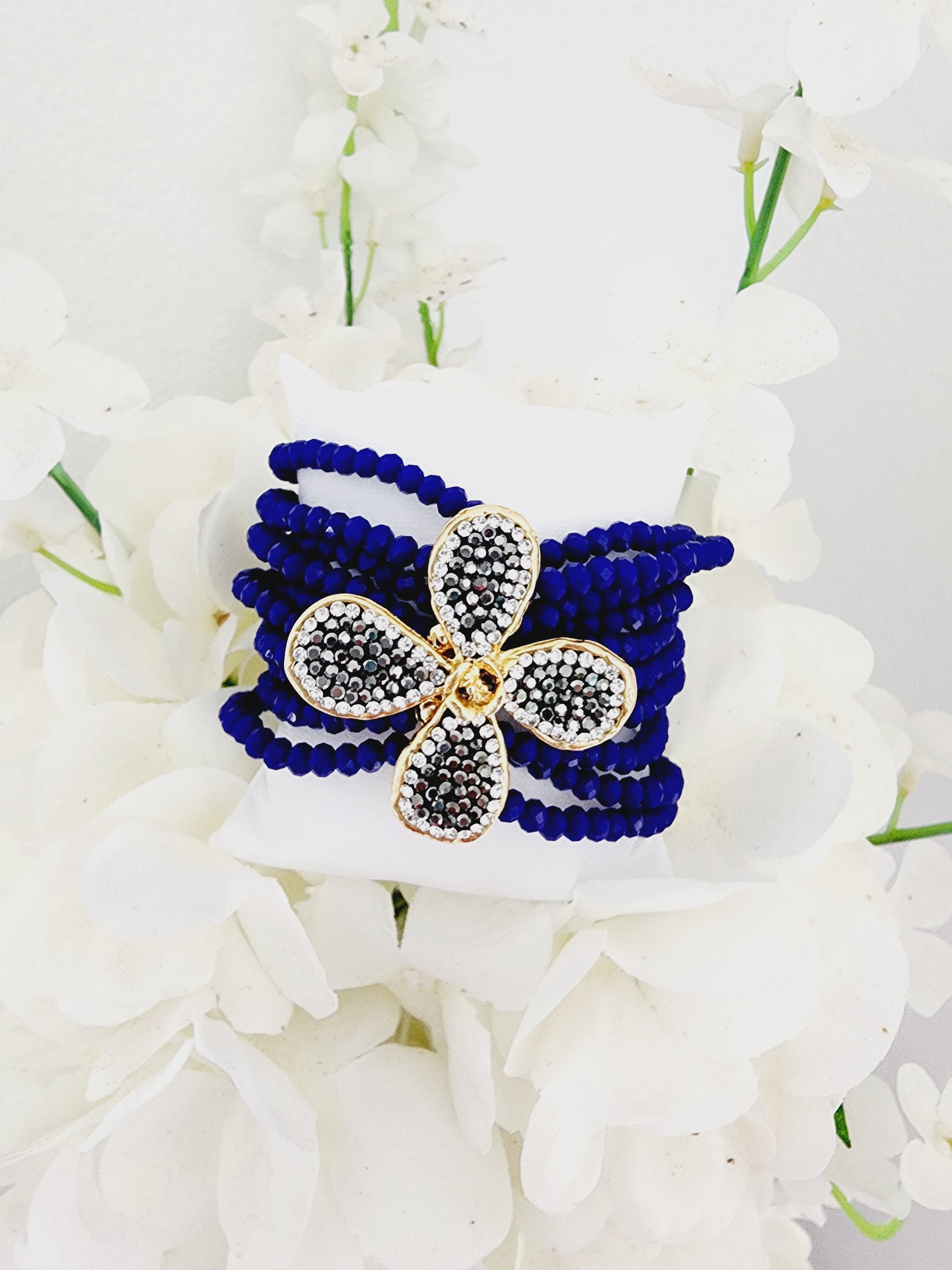 Pulsera azul royal de varias tiras en piedras con hermosa flor grande llena de brillo como te gustan para marcar la diferencia. Una pulsera que se hace sentir.