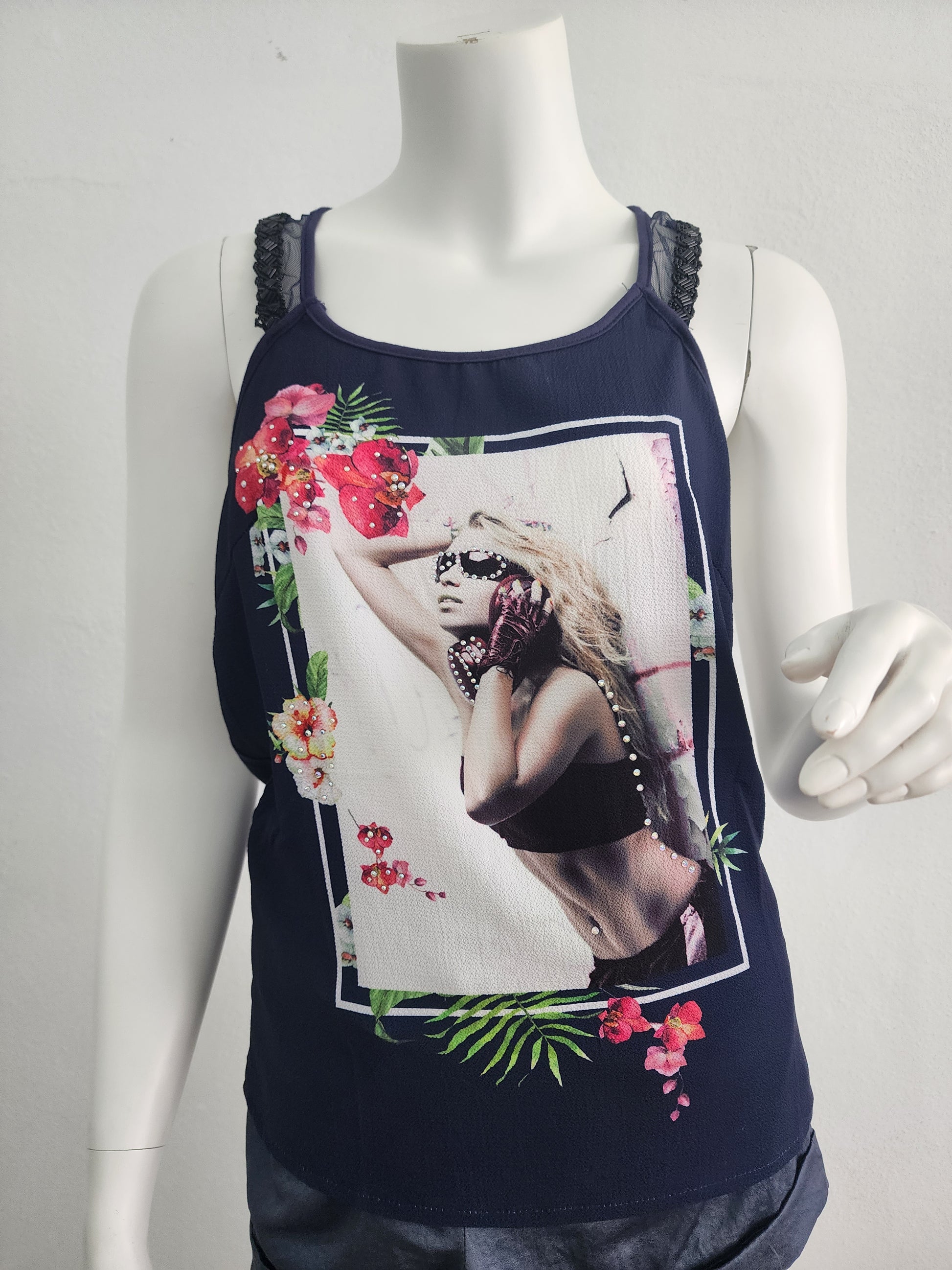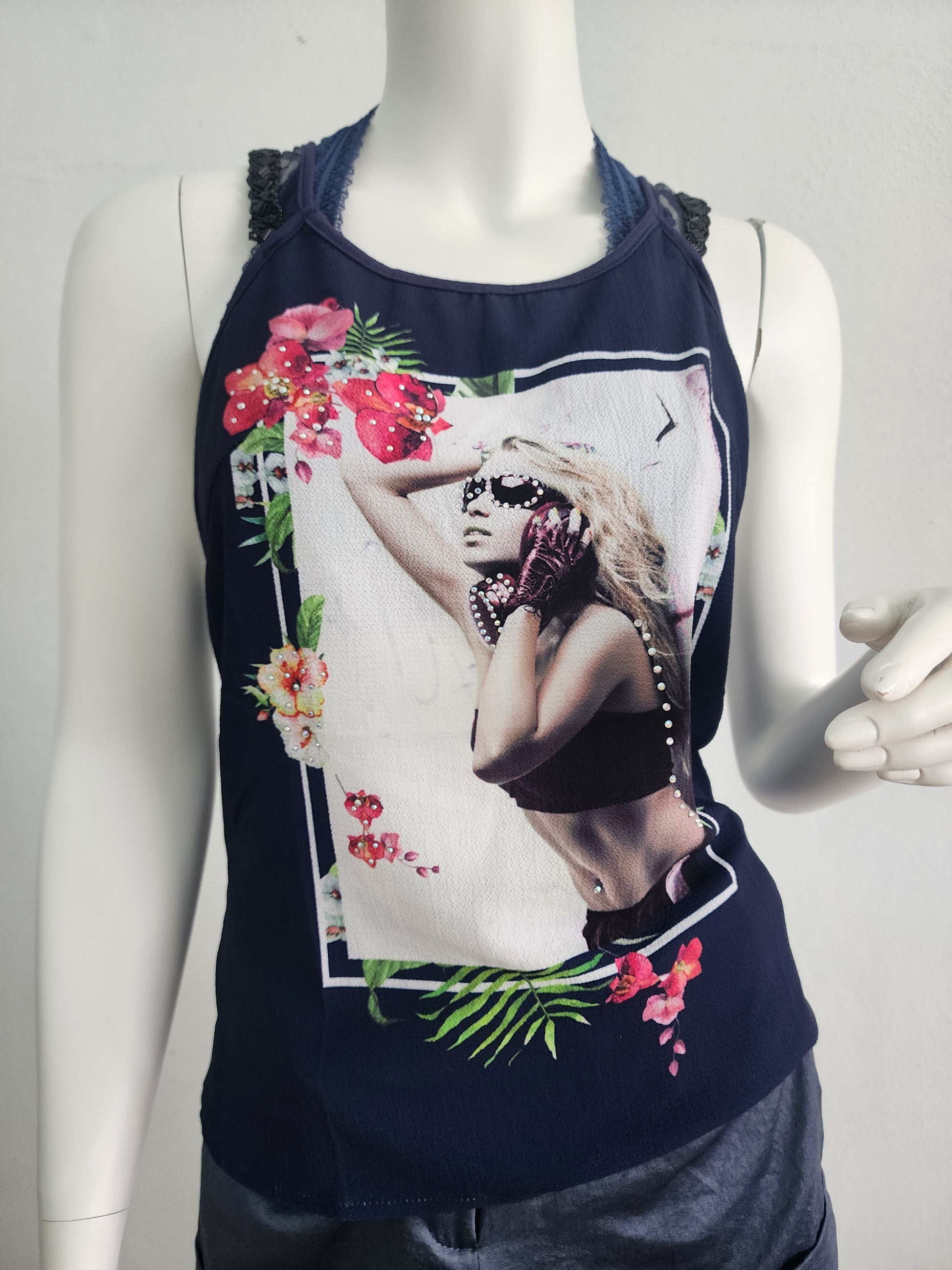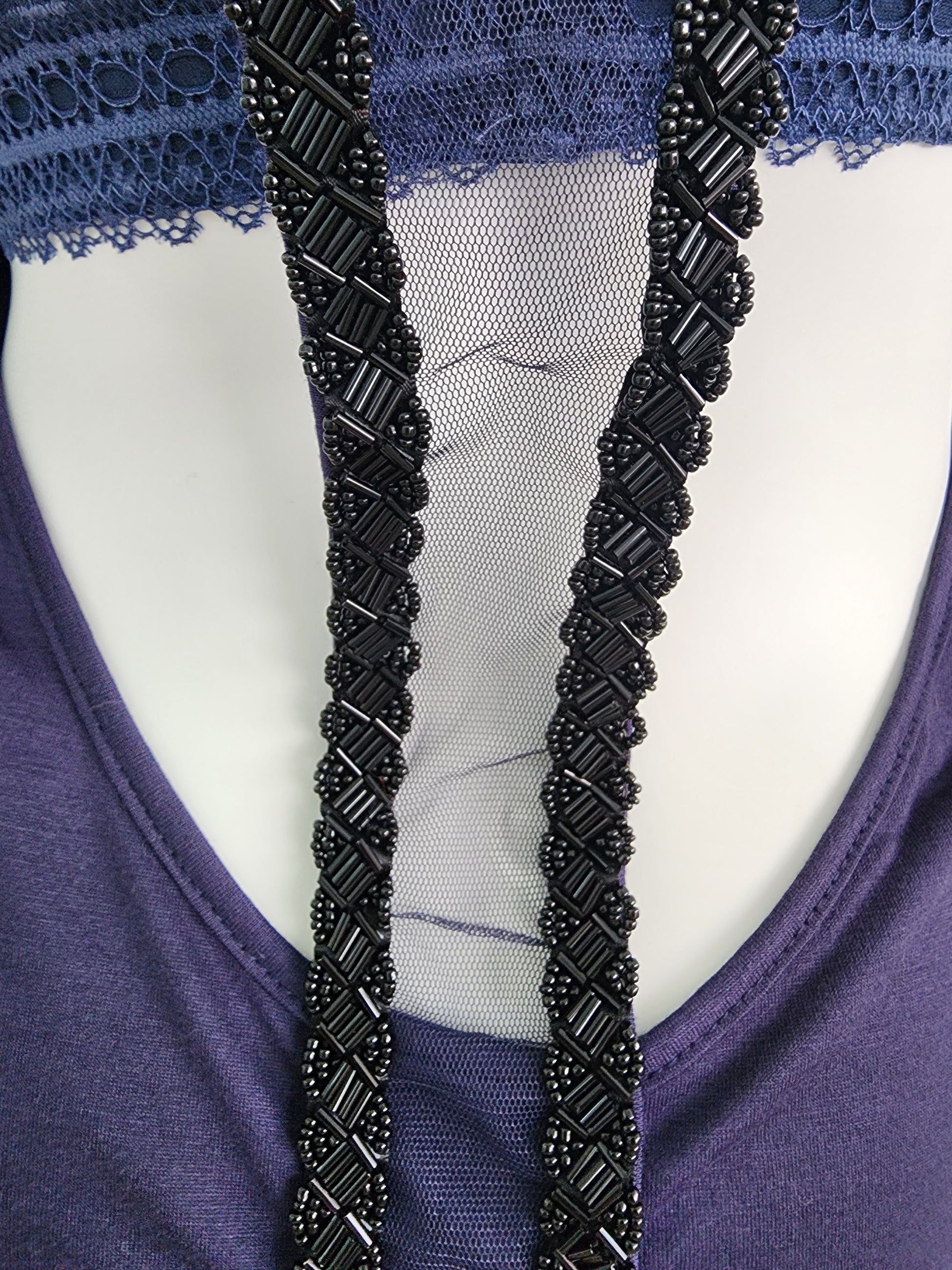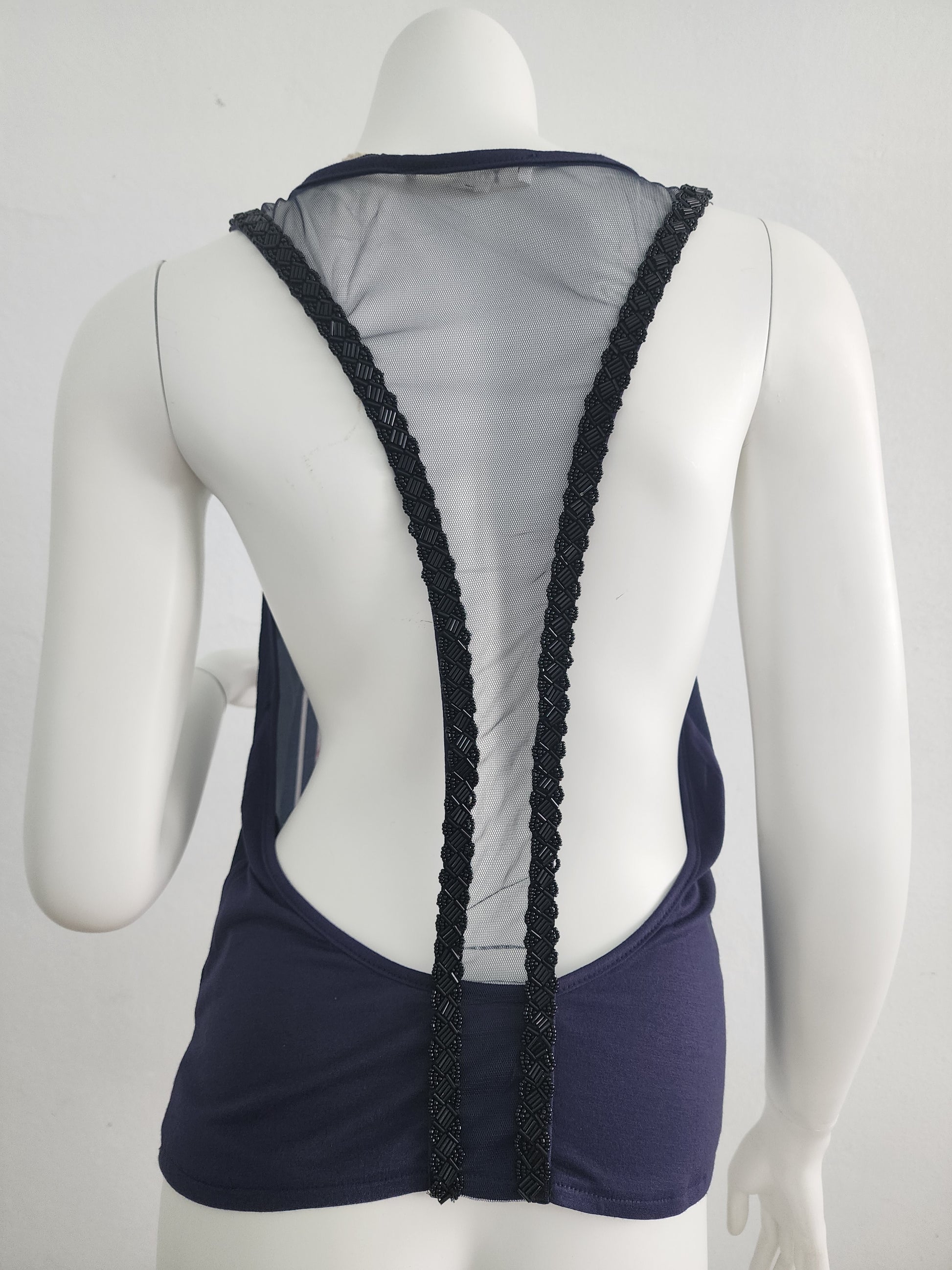 Beautiful and sexy navy blue shirt with a woman on the front and the back in transparency with beads. Take that sensual woman who lives in you for a walk.