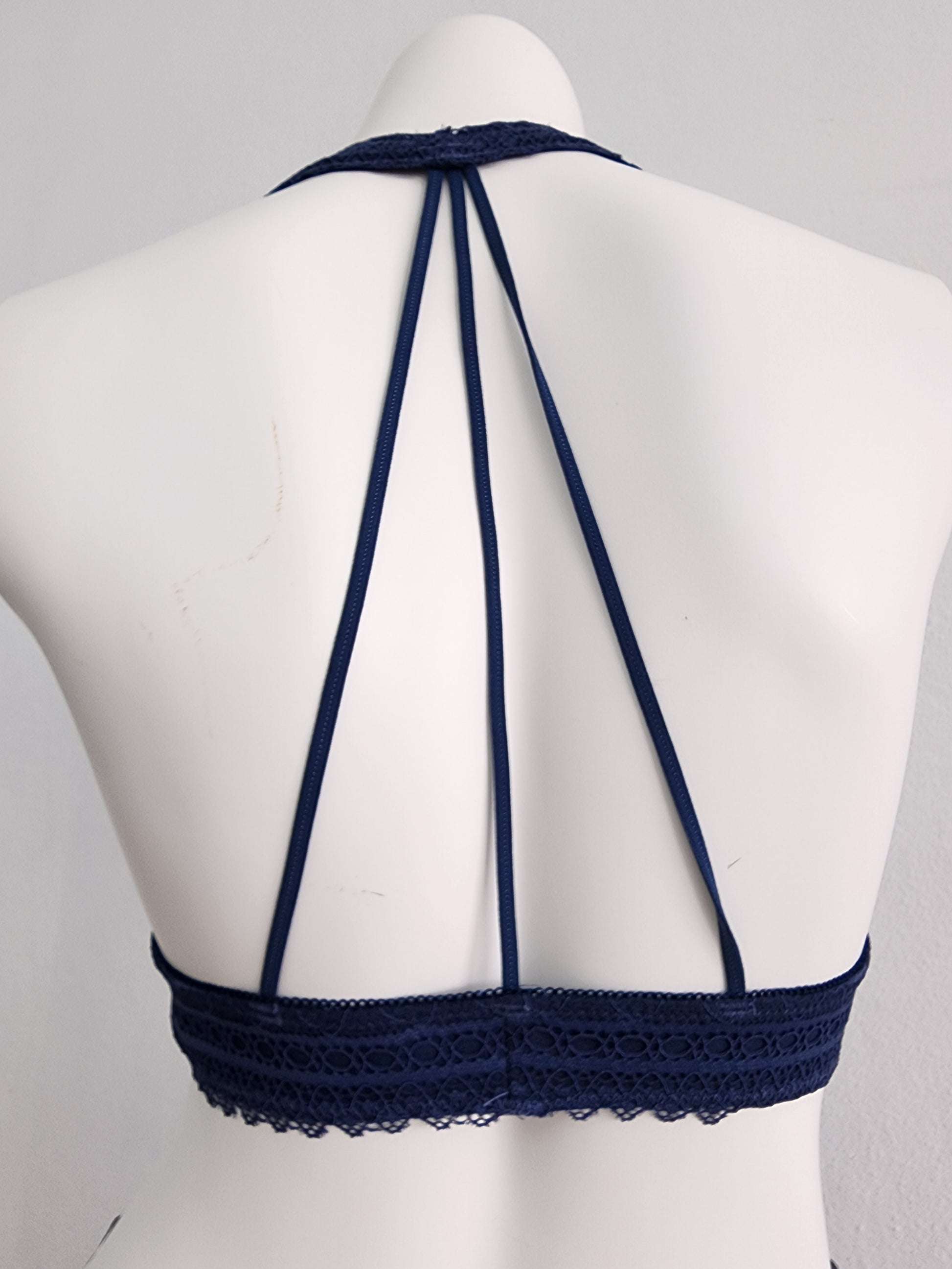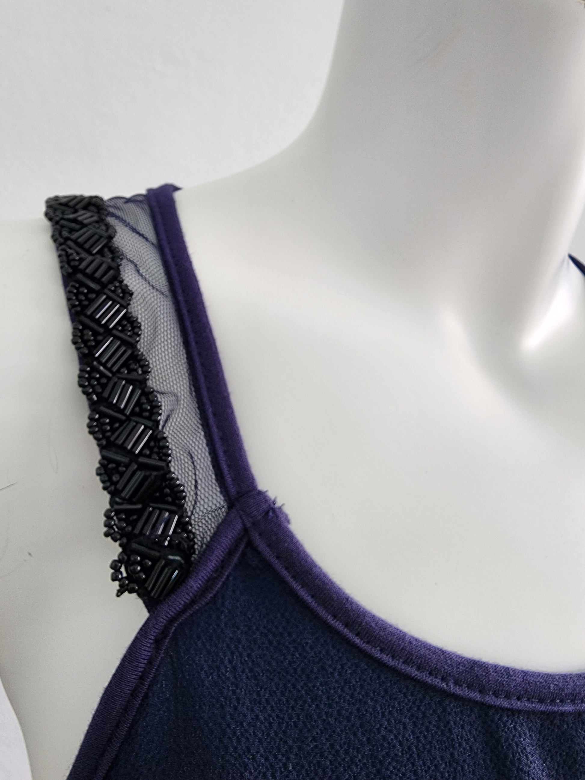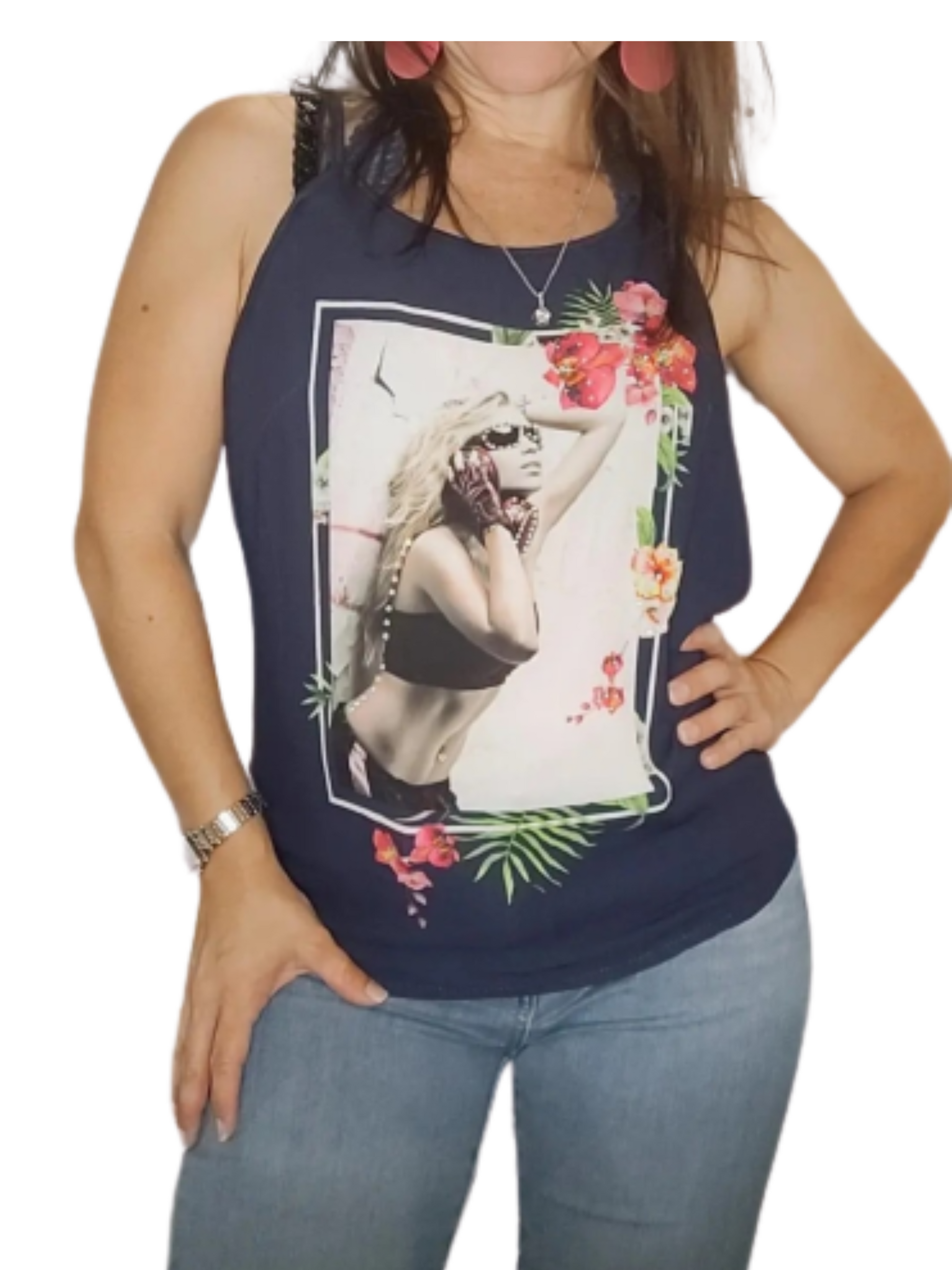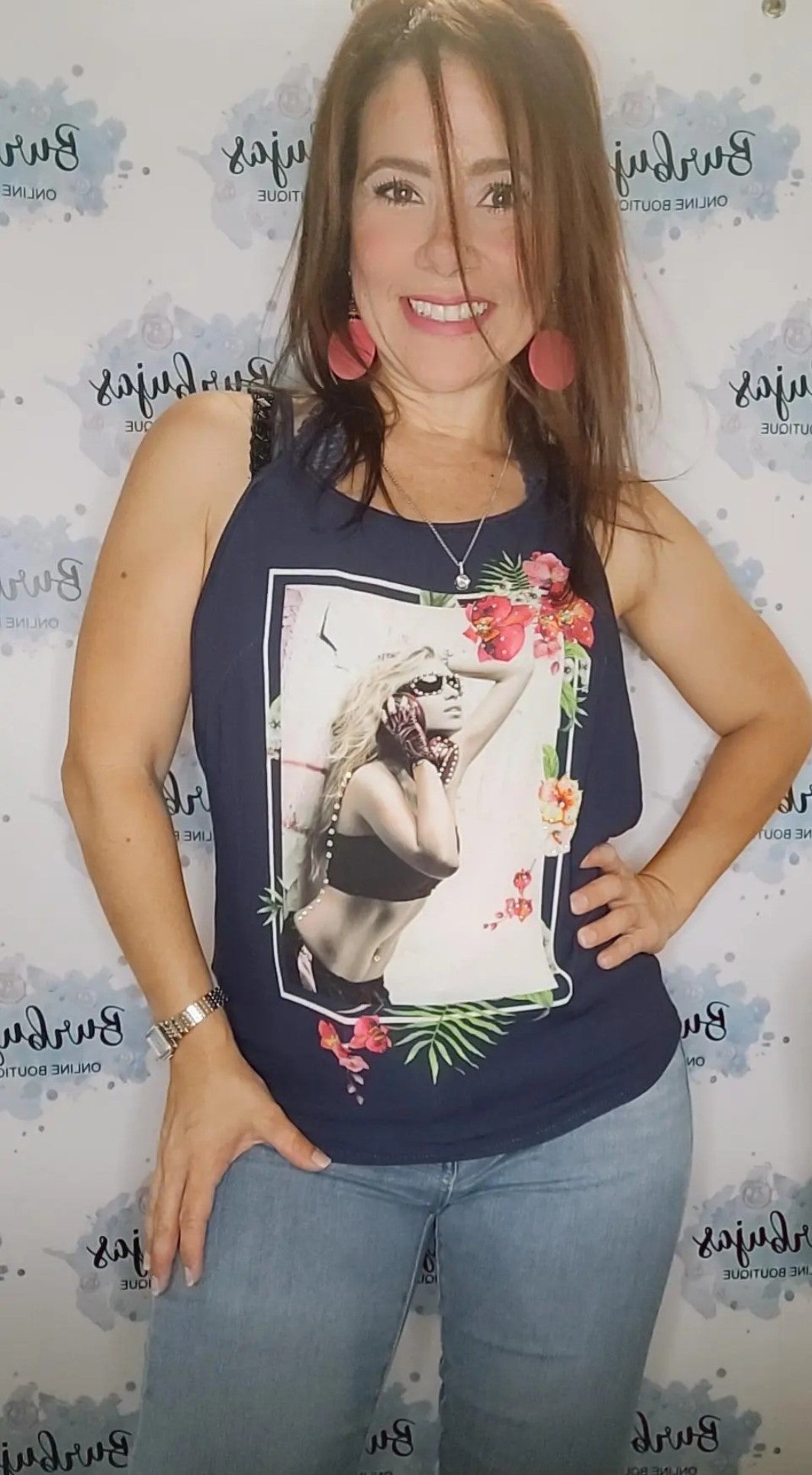 Beautiful and sexy navy blue shirt with a woman on the front and the back in transparency with beads. Take that sensual woman who lives in you for a walk.