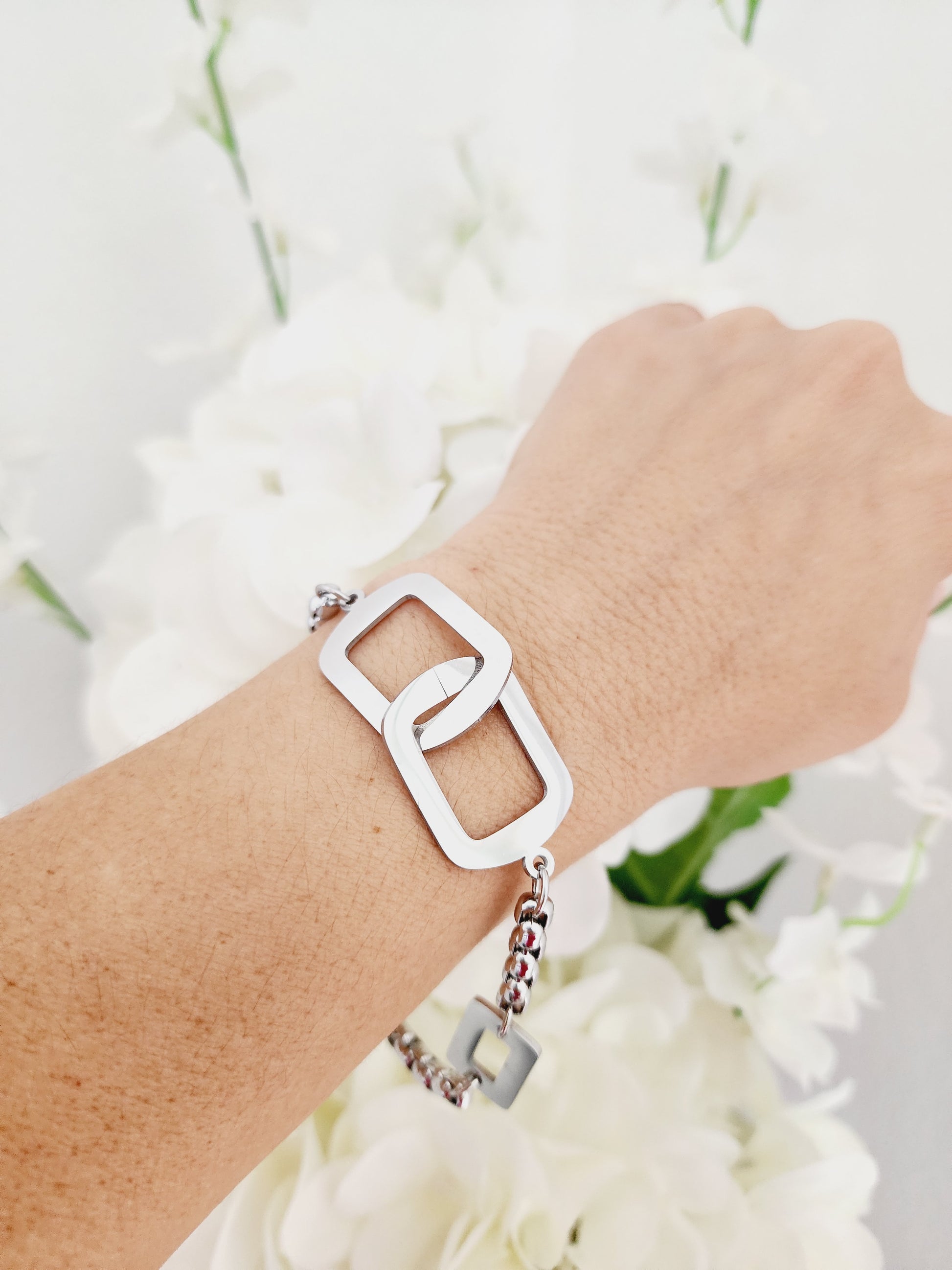 Pulsera plateada en steel con cuadrados en tamaños diferentes. Luciendo tus accesorios como tanto te gustan. Conciente tus gustos, te lo mereces.