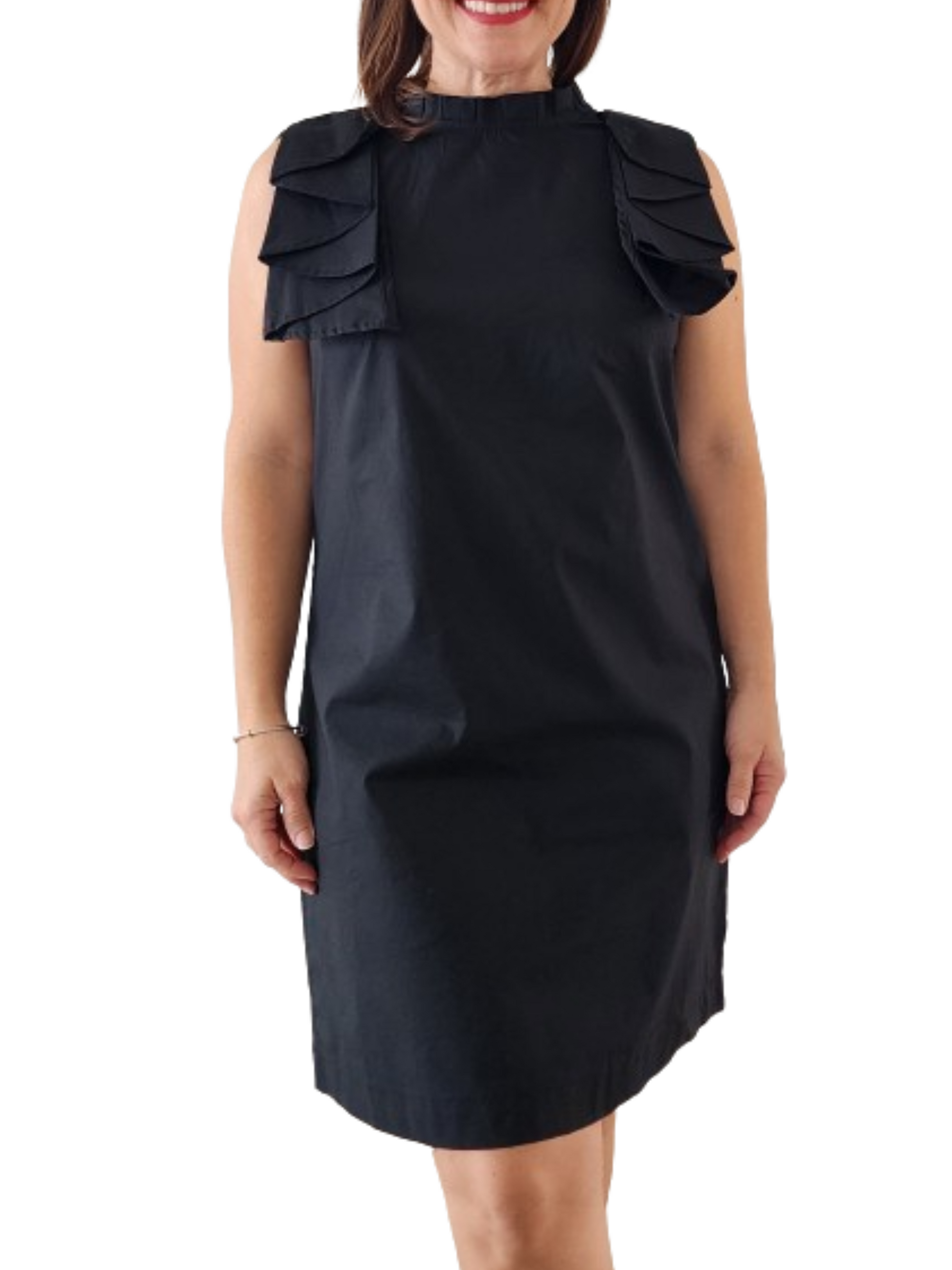 Vestido sin mangas con detalle plisado que sale de los hombros, tiene un corte alto alfrente y cierra con zipper en la parte de atrás. Luce muy bello, fino y elegante. Esta perfecto para cada ocasión.