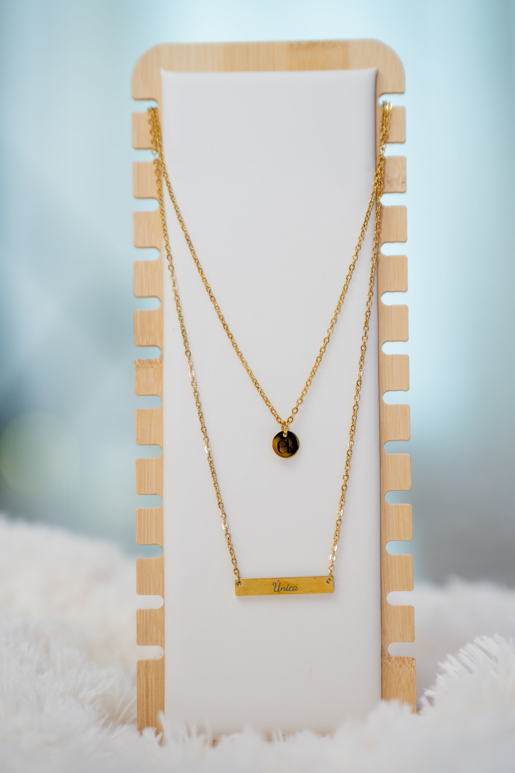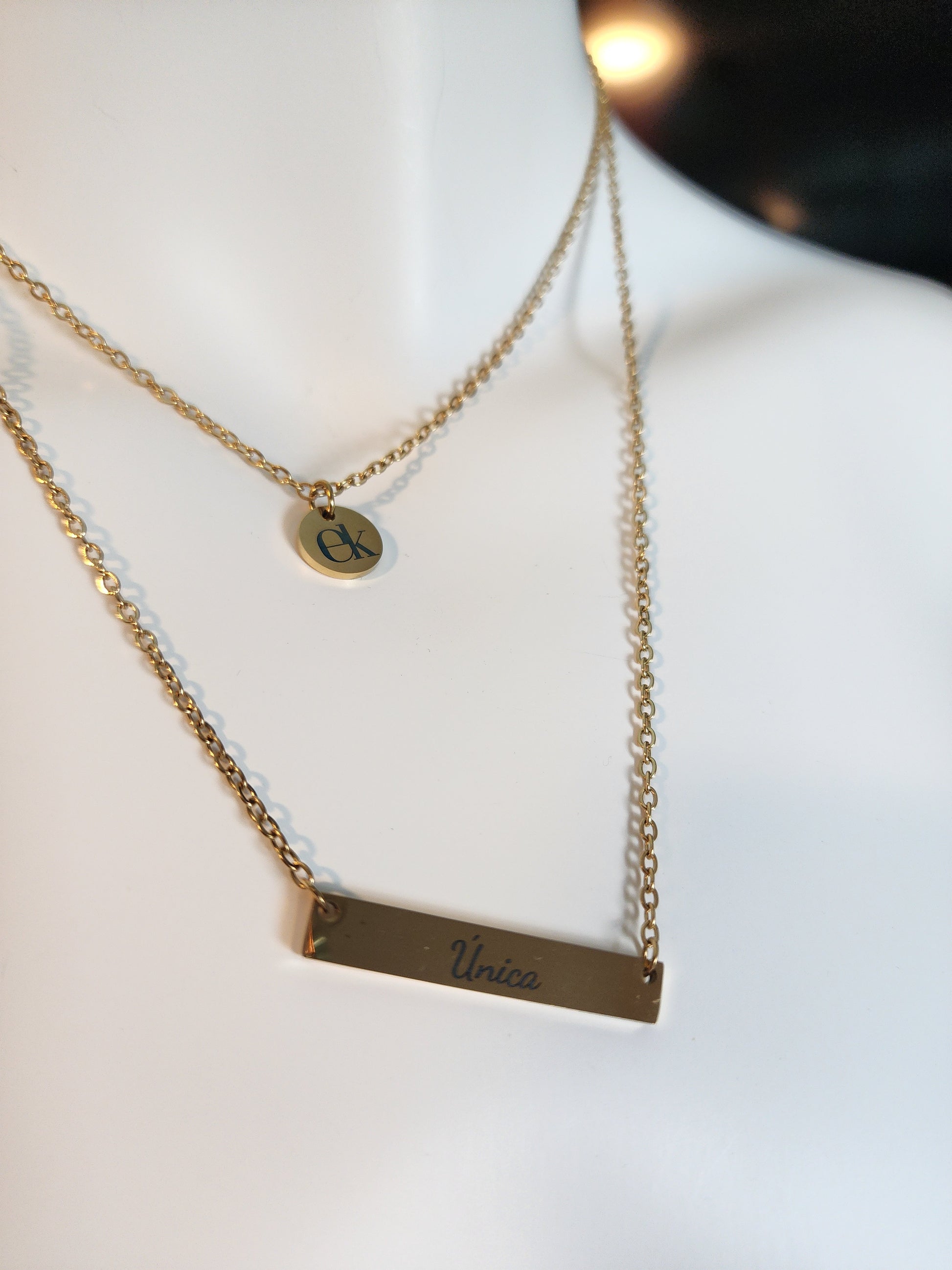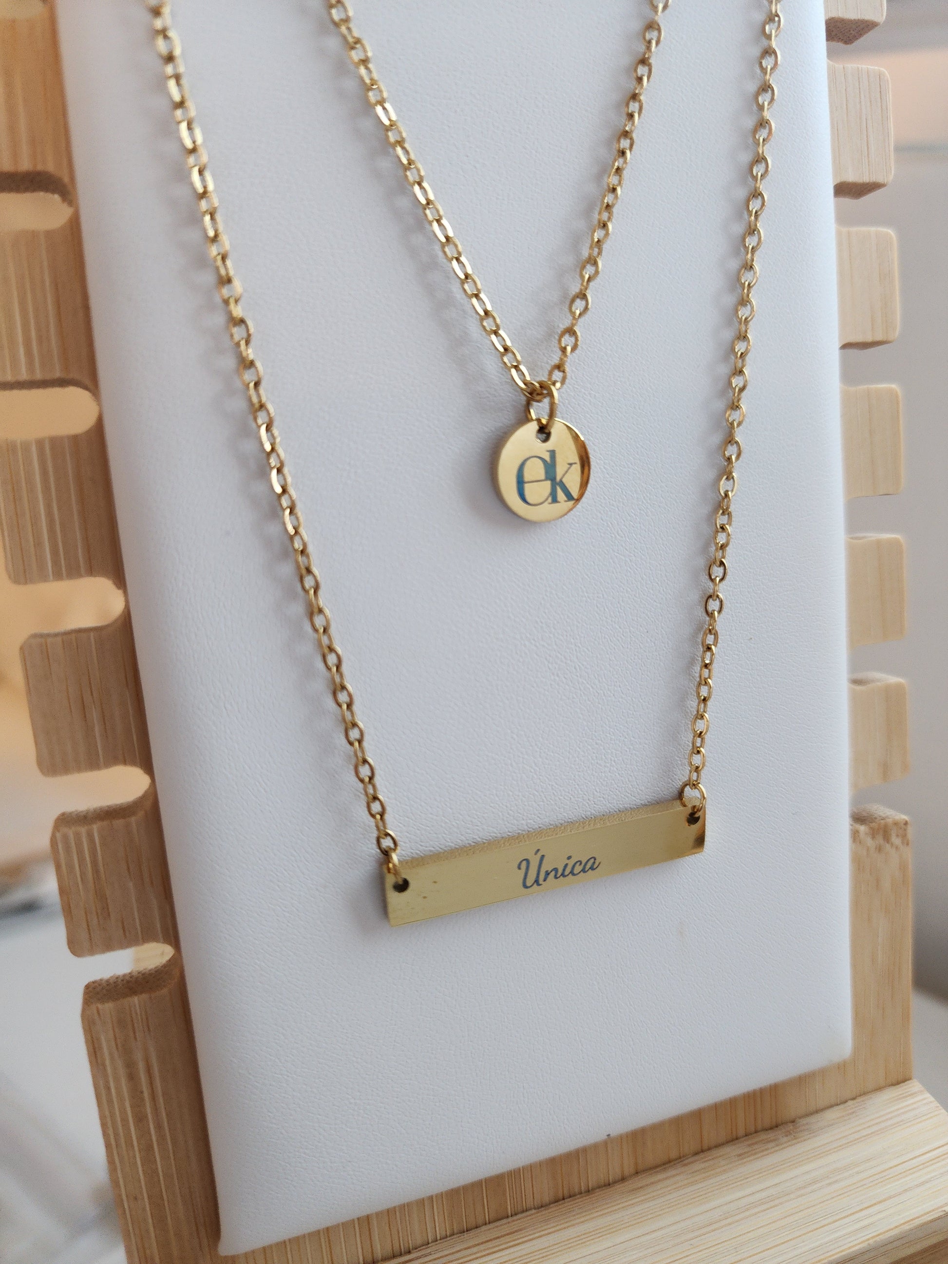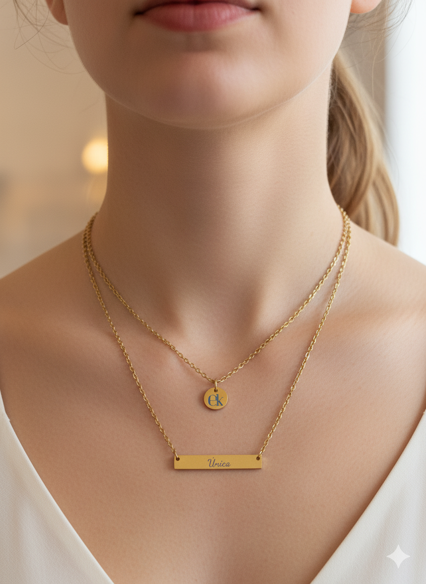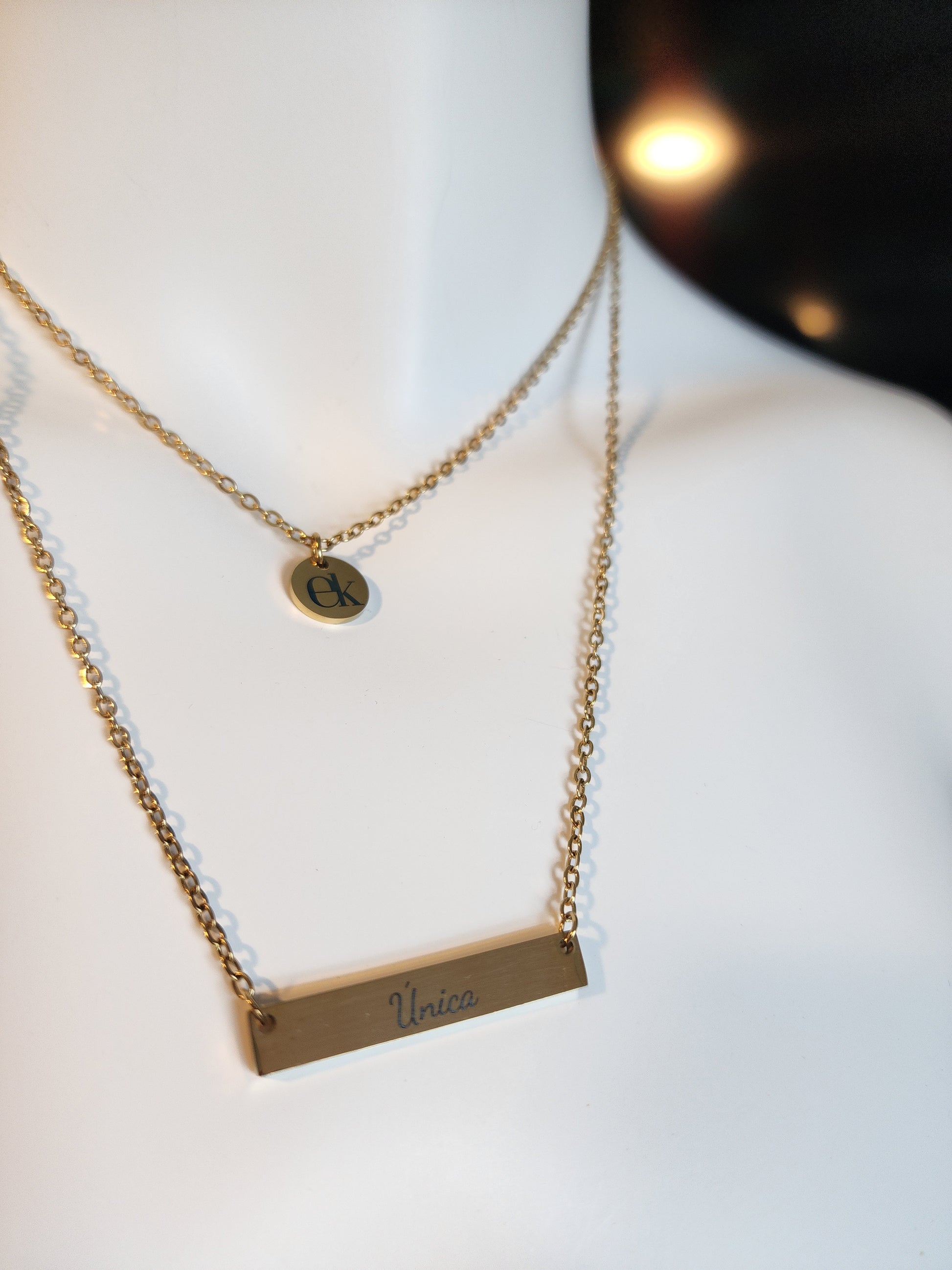 Porque nadie más brilla como tú, esta pieza fue creada para recordarte que eres irrepetible, valiosa y auténtica. La cadena doble (una más corta y otra más larga en una sola pieza) combina un estilo retro elegante con un mensaje que inspira: en la cadena corta, el dije con la EK de Escentik, y en la larga, la palabra poderosa “Única”, para que la lleves siempre contigo como un recordatorio de tu esencia.
