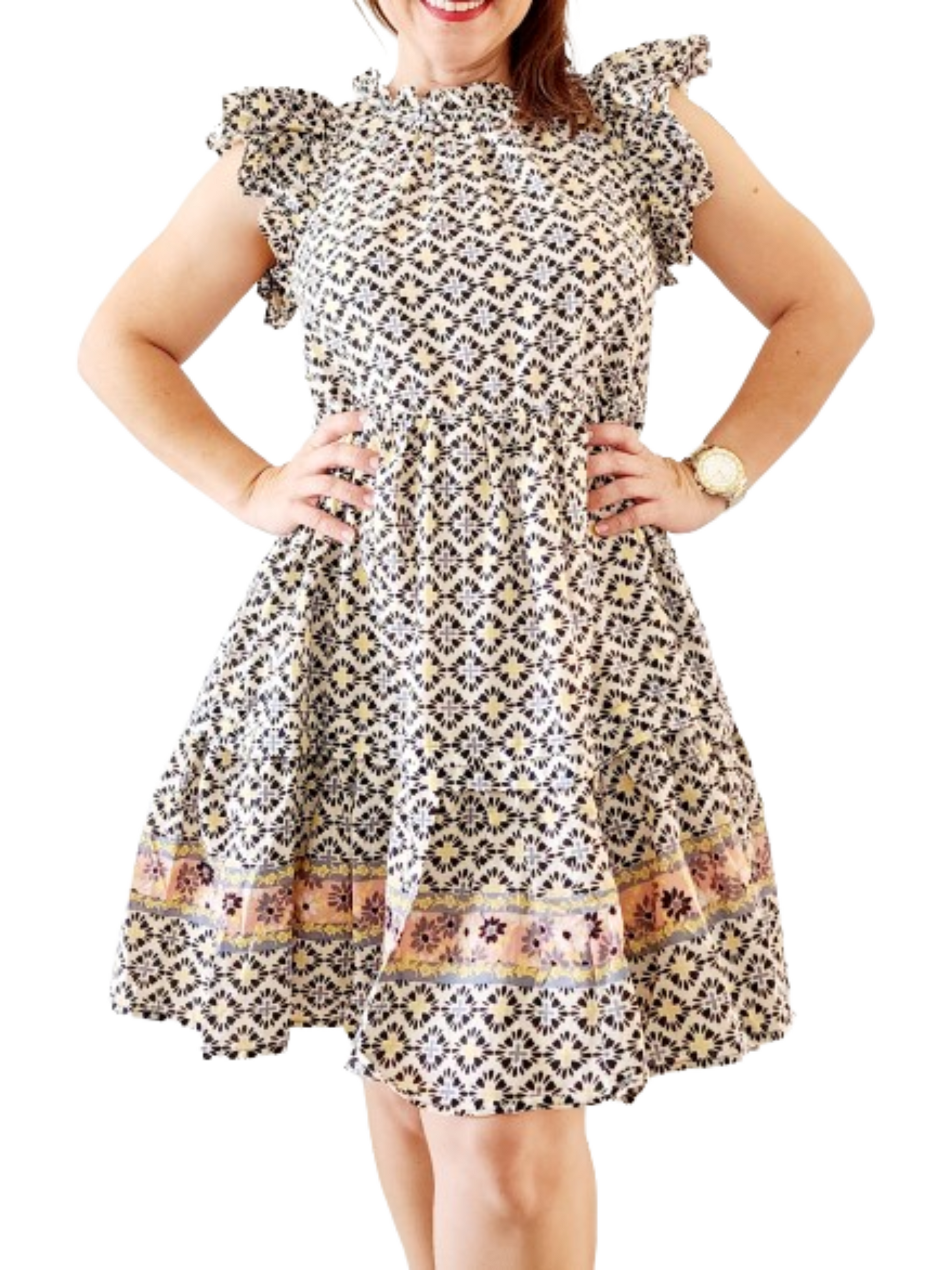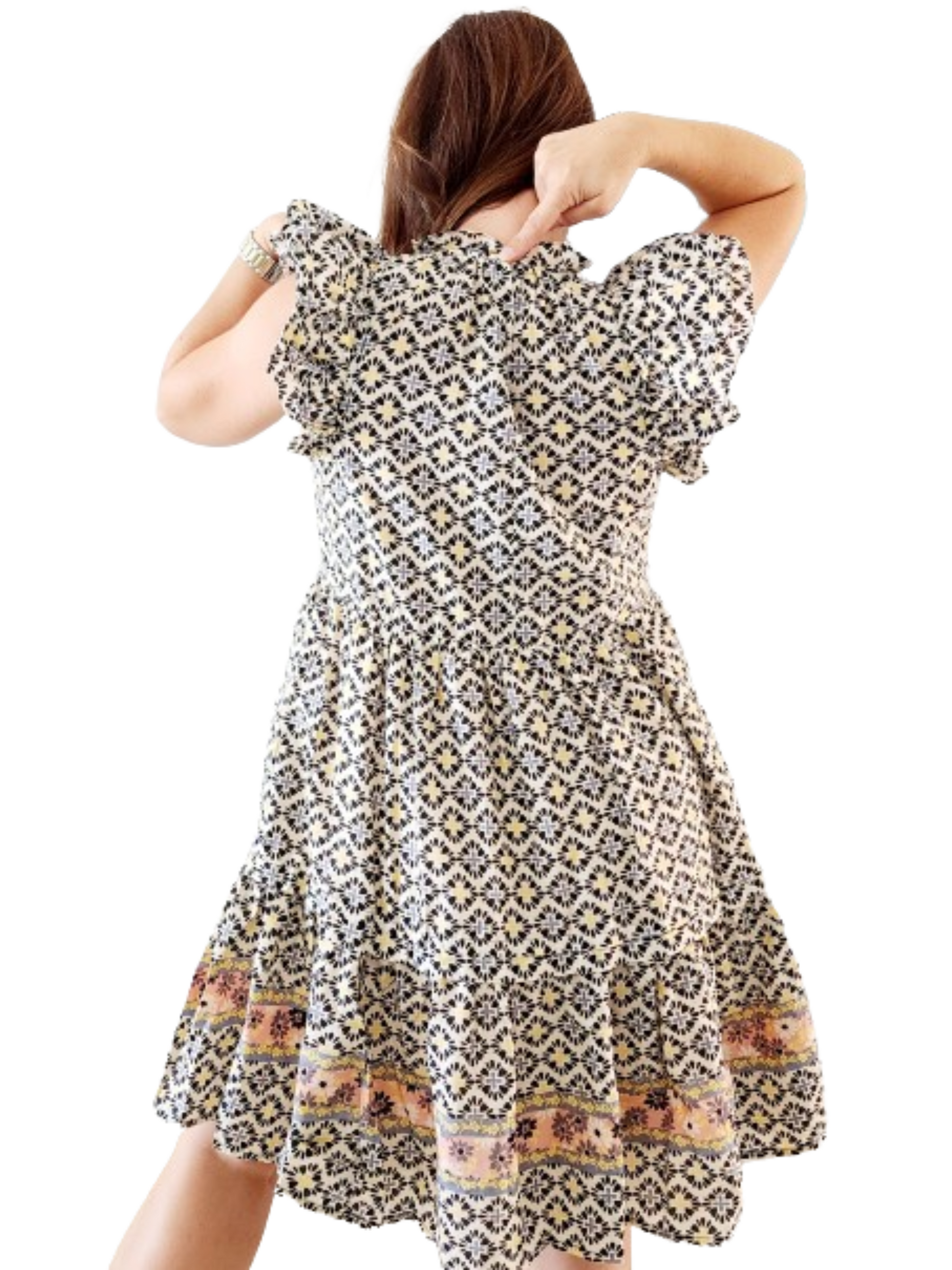 Vanilla and black print suit with small ruffle-style sleeves, tight at the top and wide at the bottom. It is a dress with a chic and refreshing touch.
