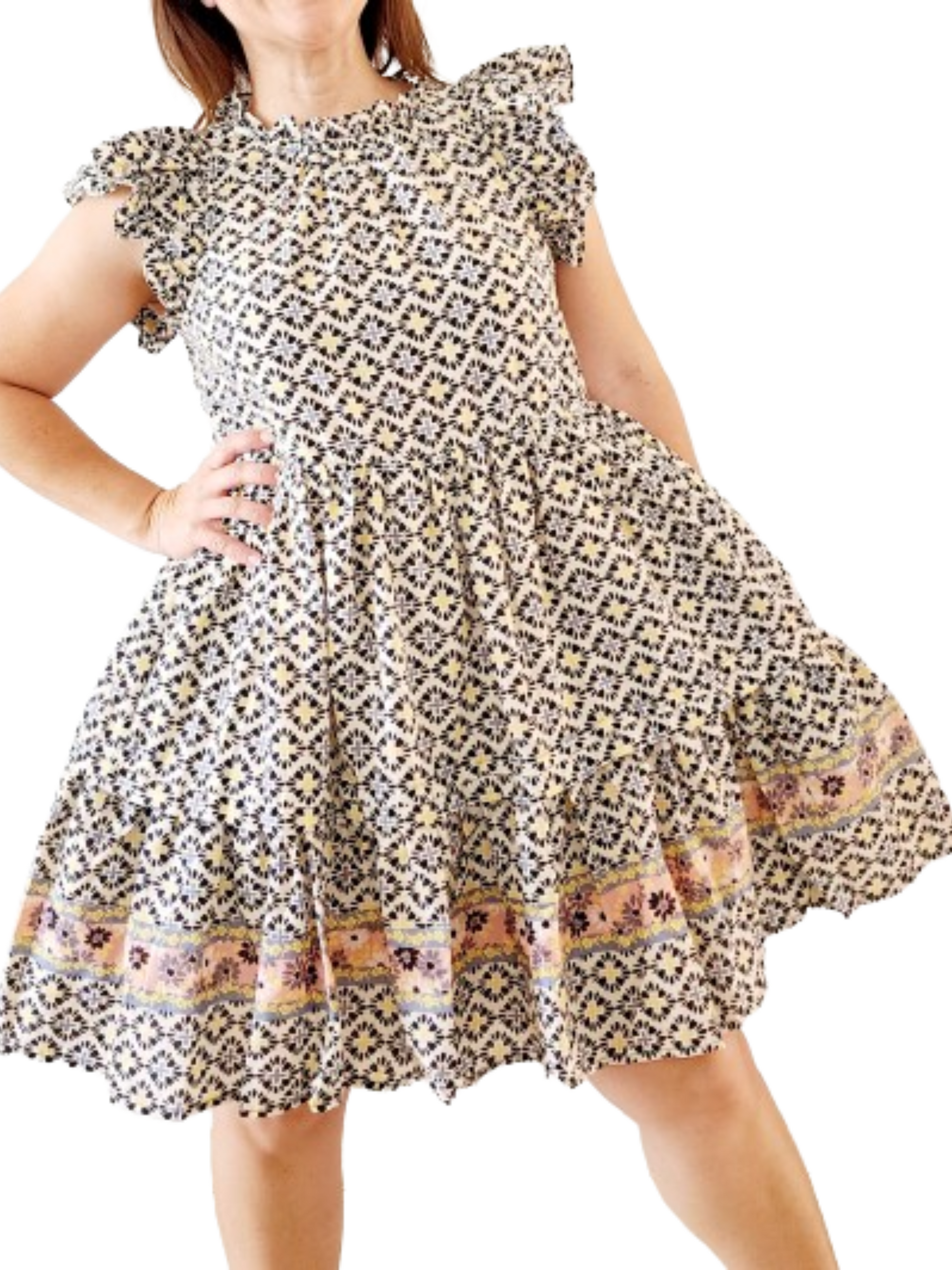 Traje de estampado vanilla y negro con mangas al estilo volante pequeño, queda pegado en la parte de arriba y ancho abajo. Es un vestido con un toque chick y refrescante.