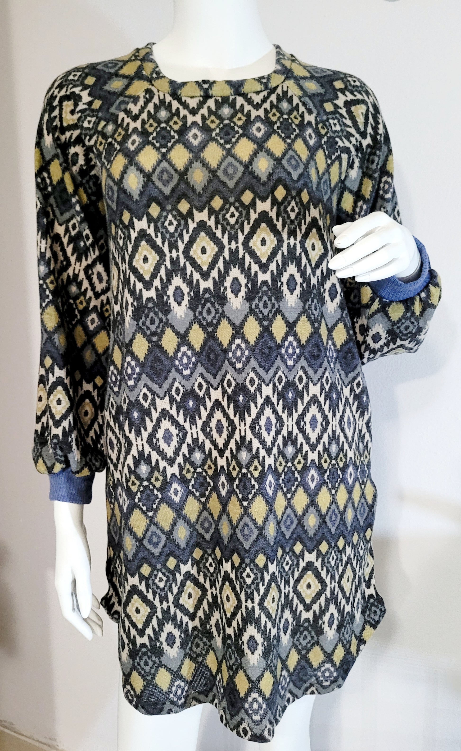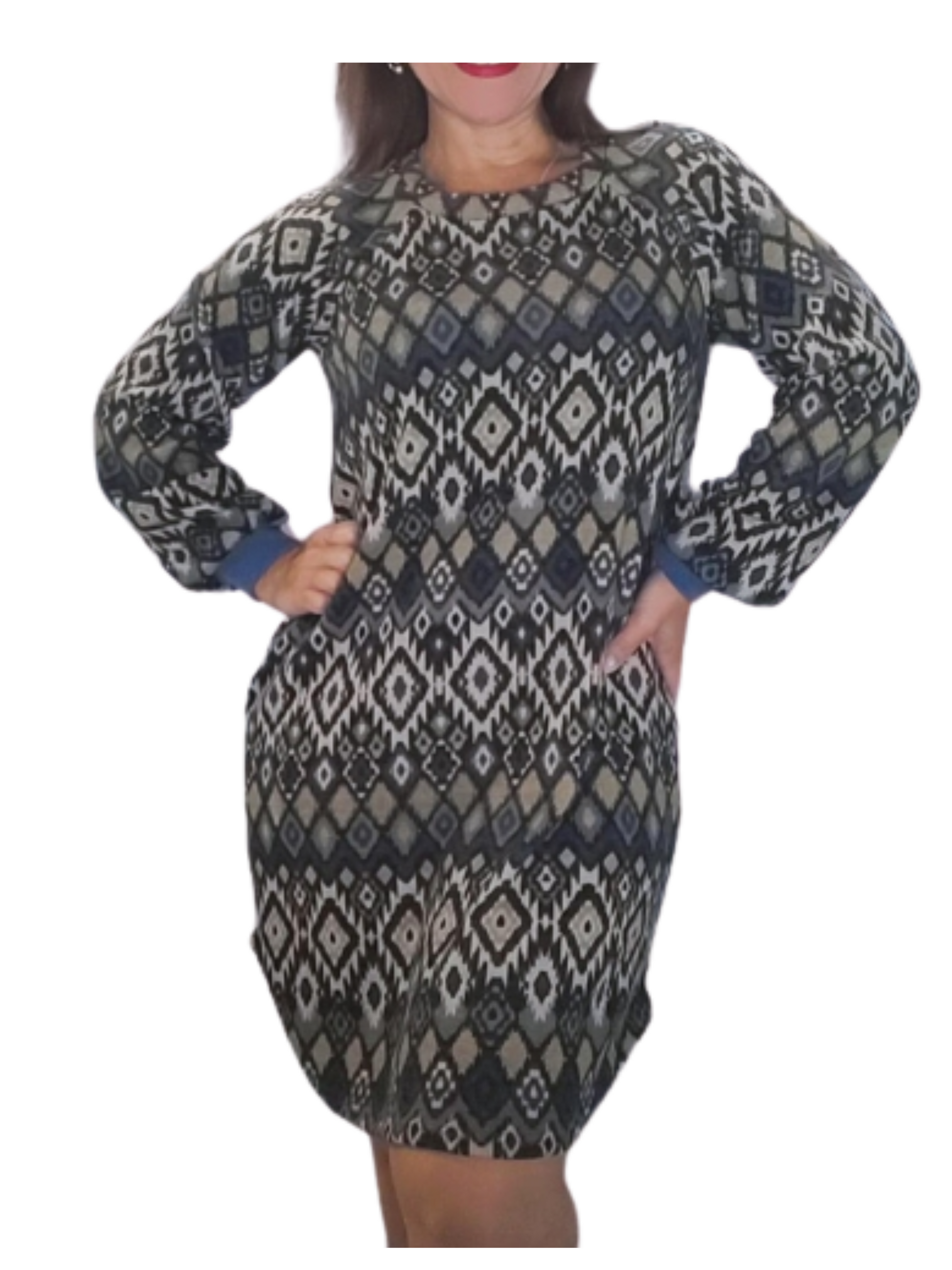 Beautiful long-sleeved suit and a beautiful print. The sleeve cuff is blue and gives it a perfect touch. She has pockets on both sides. Just the one you were looking for for your party these days. Strap is sold separately, look for it in accessories.
