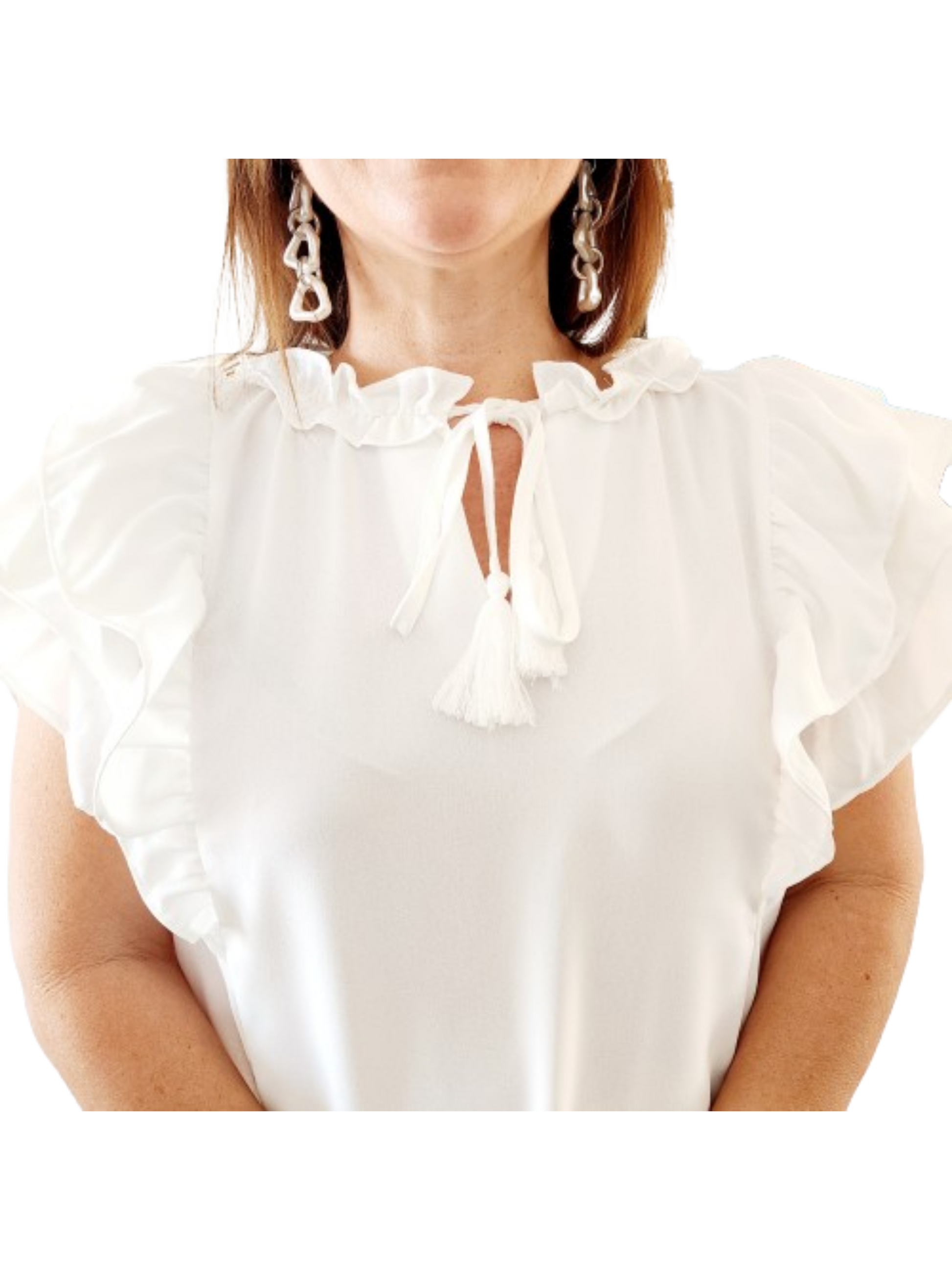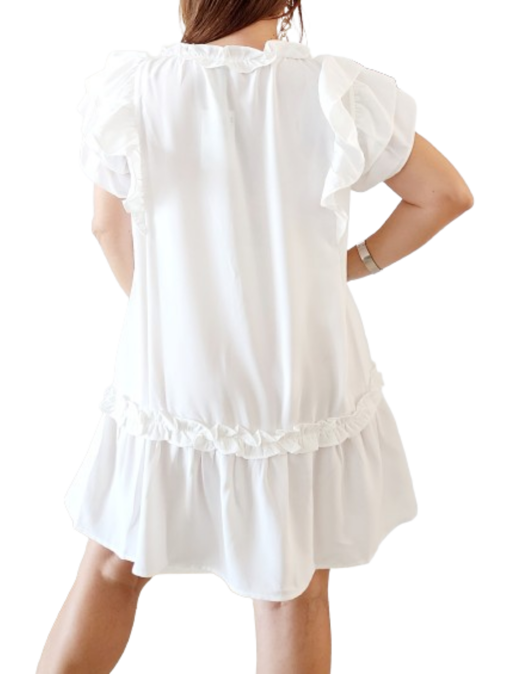 Vestido blanco, ancho con amarre en el cuello en sogas, bolsillos, volantes en las mangas y un delicado detalle en la parte de abajo. Luce divino y delicado para esa actividad que tienes.